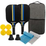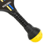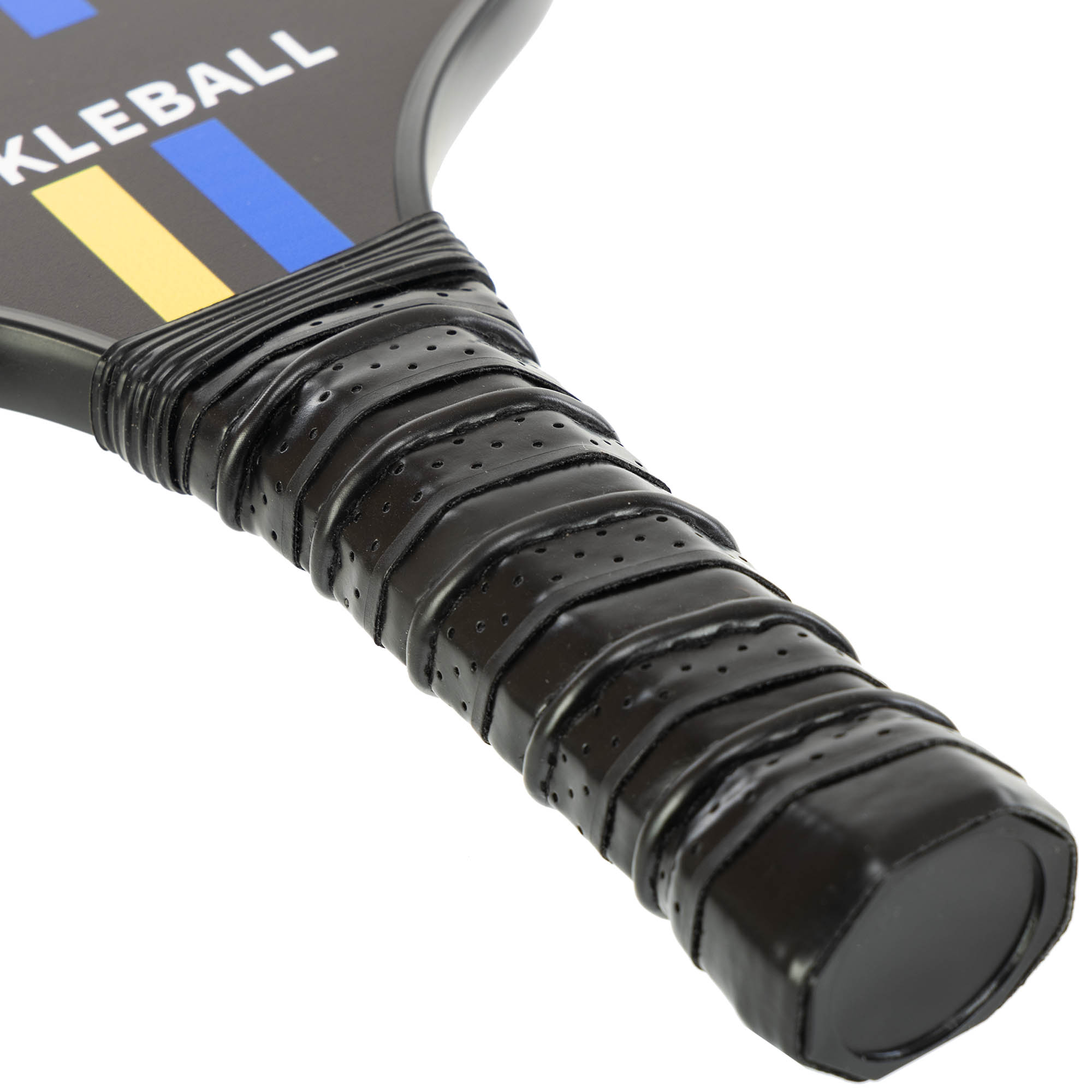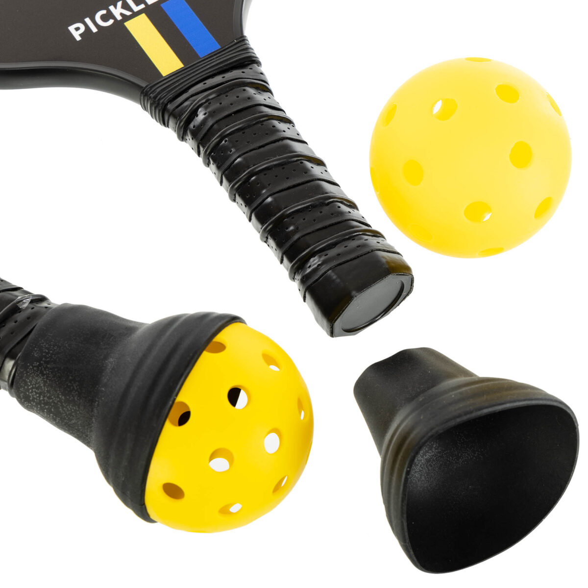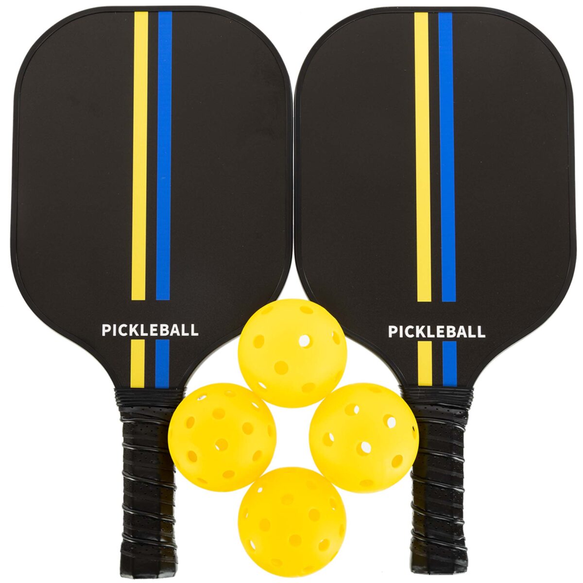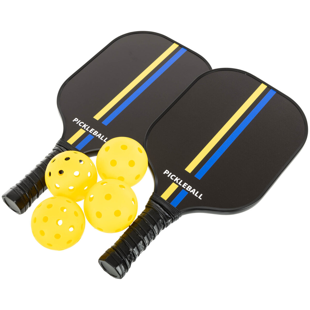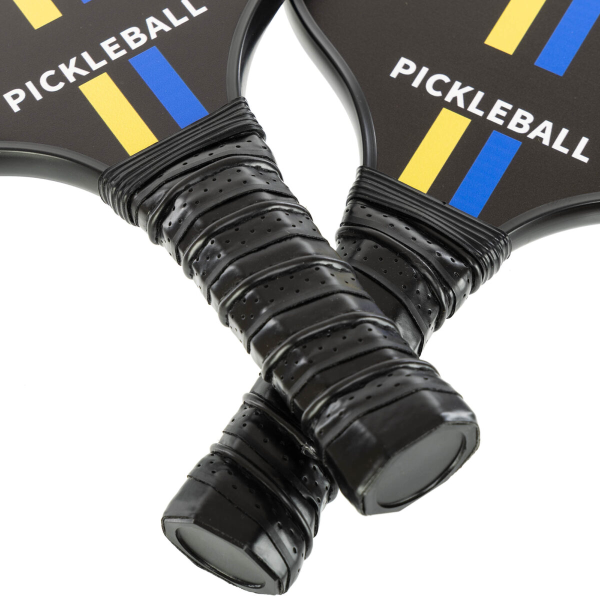 Набор для пиклбола содержит всё необходимое для игры. В такой набор входят пара ракеток, изготовленных из дерева и окрашенных краской, а также четыре мячика и два охлаждающих полотенца. Весь набор упакован в специальный чехол на молнии с ручкой. В чехле набор можно хранить и транспортировать. Деревянные ракетки для пиклбола считаются наиболее простыми, доступными и надёжными. Изготовленные из сплошного куска древесины, они обладают большим запасом прочности. Ширина весла составляет 200 мм, а его длина — 265 мм. При этом окружность рукоятки составляет 10 см, а её длина — 125 мм. Ручка обеспечивает комфортный захват ракетки.