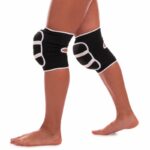 Защитная экипировка удерживается на ногах благодаря компрессионным свойствам материала. Ткань наколенника дышит. Экипировка легко надевается и снимается.
