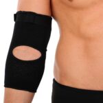 Конструкция налокотника продумана до мелочей: специальное отверстие в зоне сгиба локтя дает возможность свободно двигаться, не ограничивая естественные движения руки. Эта особенность делает его не только функциональным, но и удобным для длительного ношения. Материалы, из которых изготовлен налокотник, обладают уникальными характеристиками — они быстро высыхают, хорошо дышат и впитывают влагу, что способствует созданию комфортного микроклимата и предотвращает перегрев кожи.