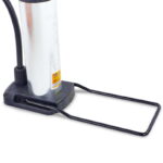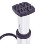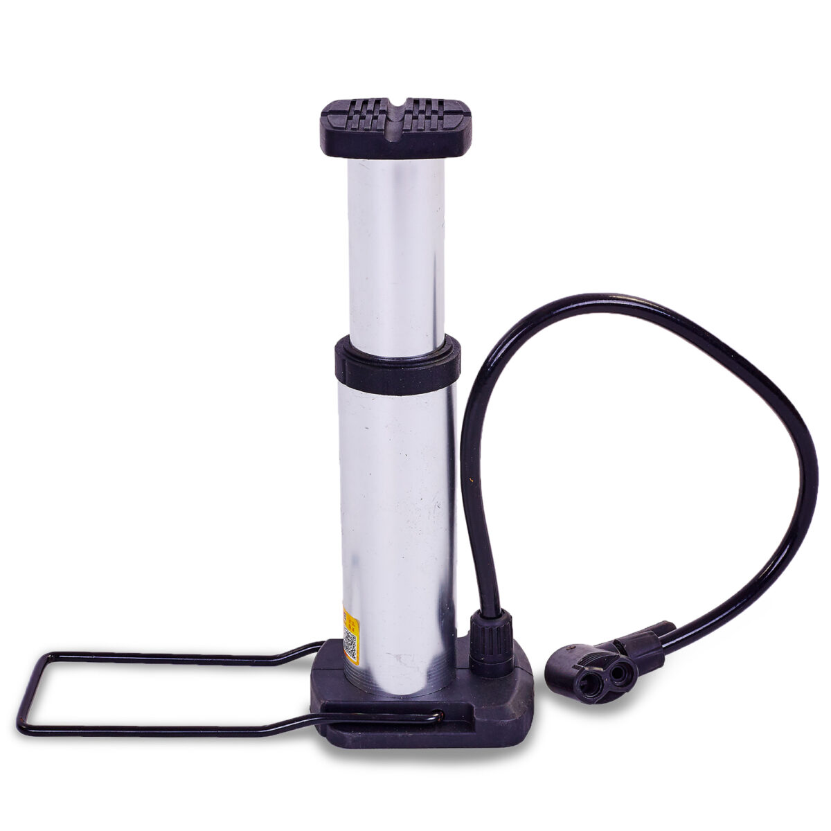 Ножной насос — это универсальное приспособление, которое подойдет для накачивания автомобильных или велосипедных шин и спортивных мячей. Корпус насоса имеет цилиндрическую форму, его диаметр составляет 4,3 см. Длина насоса составляет 17 см. Для изготовления насоса использован прочный, но легкий материал — алюминий. Накладка на «педали» изготовлена из прочного пластика. На накладке для ноги имеется рельефный рисунок, который препятствует соскальзыванию обуви с поверхности педали.