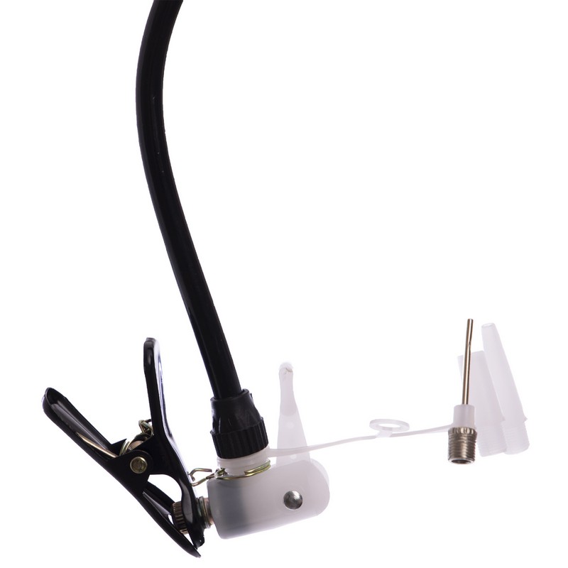Шланг изготовлен из гибкого и прочного материала. Клапан совместим с большинством видов ниппелей и может использоваться для накачивания велосипедных шин, а также для установки иголок для мячей и переходников для надувных изделий.