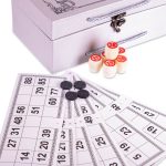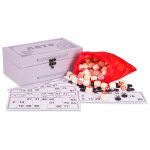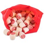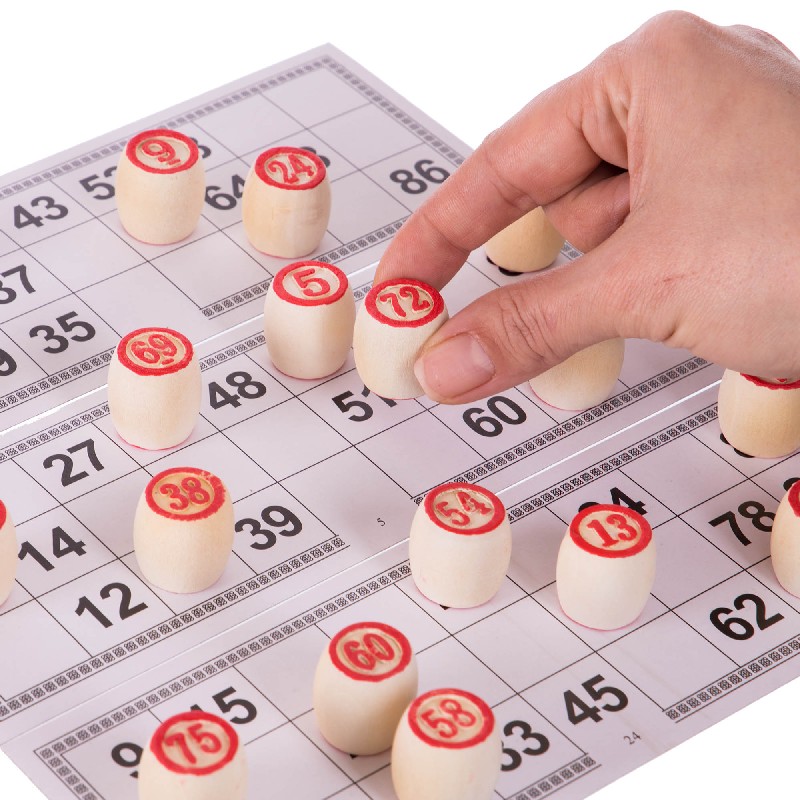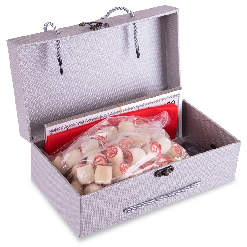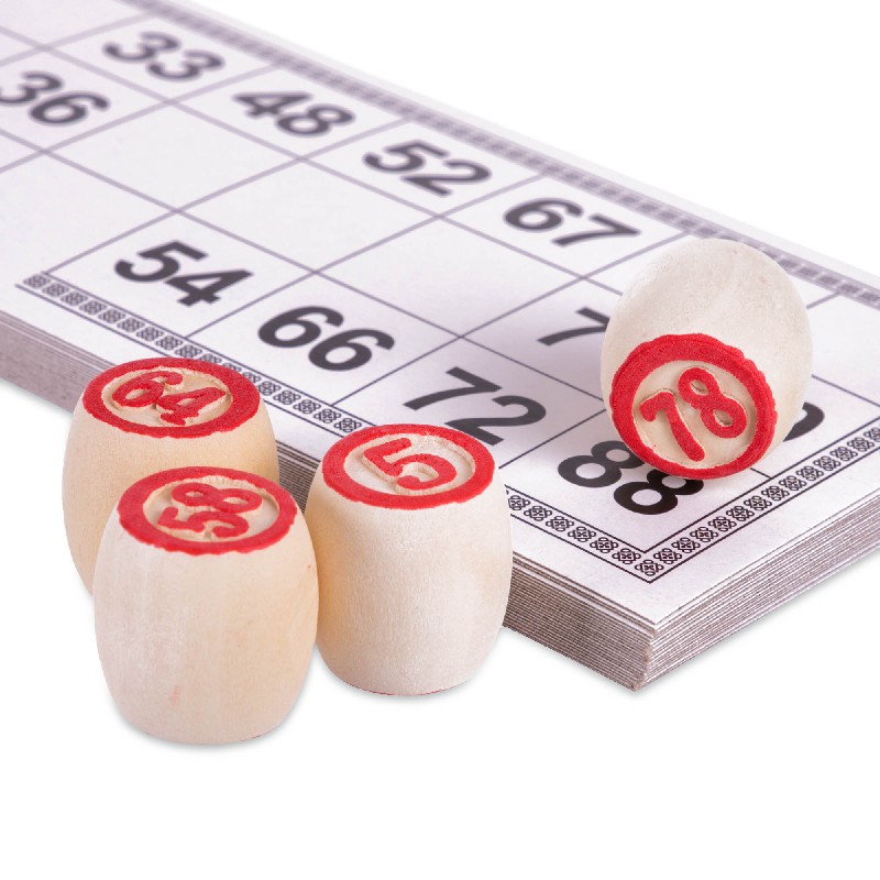 В комплект входит набор бочонков, пронумерованных от 1 до 90, которые изготовлены из твёрдой, должным образом высушенной древесины, что гарантирует им долговечность – они выдерживают серьёзное механическое воздействие и не рассыхаются со временем. Также в него включены специальные карточки из ламинированного картона и пластиковые фишки, а также суконный мешочек, в который складывают бочонки во время игры. Всё это упаковано в красивый футляр, обтянутый мешковиной.