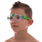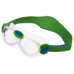 Полумаска не тонет в воде благодаря широкому неопреновому ремешку. Изделие имеет удобную боковую регулировку. Форма специально разработана под моторику детских рук. Очки-полумаска очень легкие, мягкие, комфортные и прозрачные. Широкий обтюратор из термопластичной резины защищает кожу вокруг глаз от агрессивной среды бассейна. Целлюлозно-полимерные линзы имеют защитное покрытие от ультрафиолетовых лучей UV 400. Вид переносицы — моноблок. Рамка изготовлена из полипропилена. Полумаска поставляется в защитном футляре, который можно использовать для транспортировки и хранения очков.