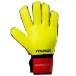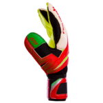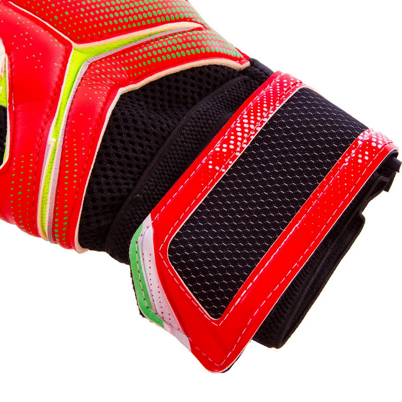 Крой пальцев — прямой, швы — наружные. Широкий ремешок на липучке и манжета с резинкой обеспечивают плотную фиксацию руки, но пальцам при этом довольно свободно. Элементы из сетчатой ткани на тыльной стороне ладони позволяют перчаткам «дышать». Защитные PVC вставки на пальцах оберегают от профессиональных вратарских травм. Внутренняя поверхность ладони шершавая, что помогает в мокрую погоду. В комплекте имеется чехол из PVC.