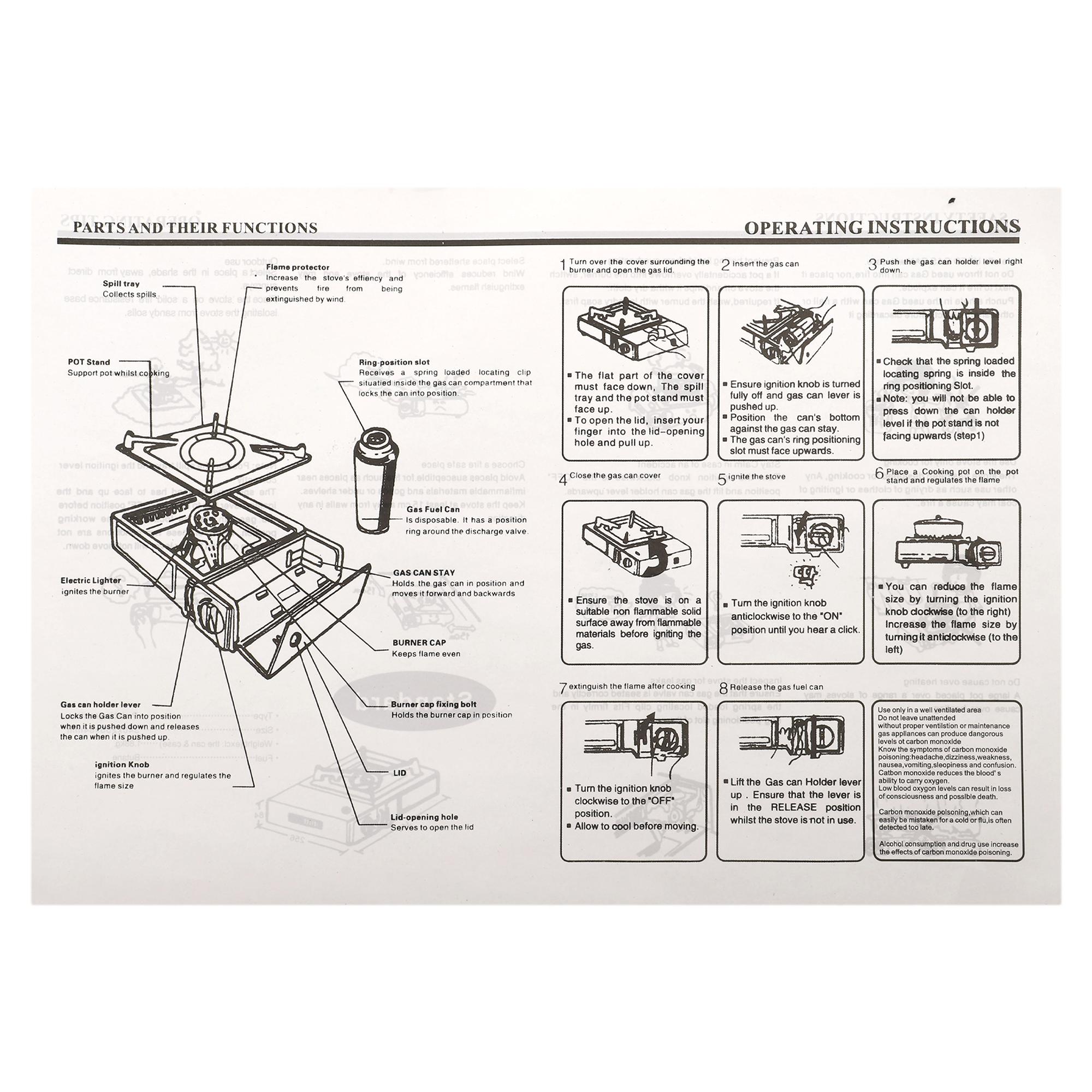Газовая туристическая плита имеет прочный металлический корпус. Баллон с газом вставляется в специальный отсек. Подключение и отключение происходит путем нажатия кнопки на корпусе.