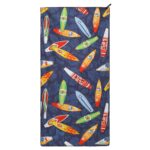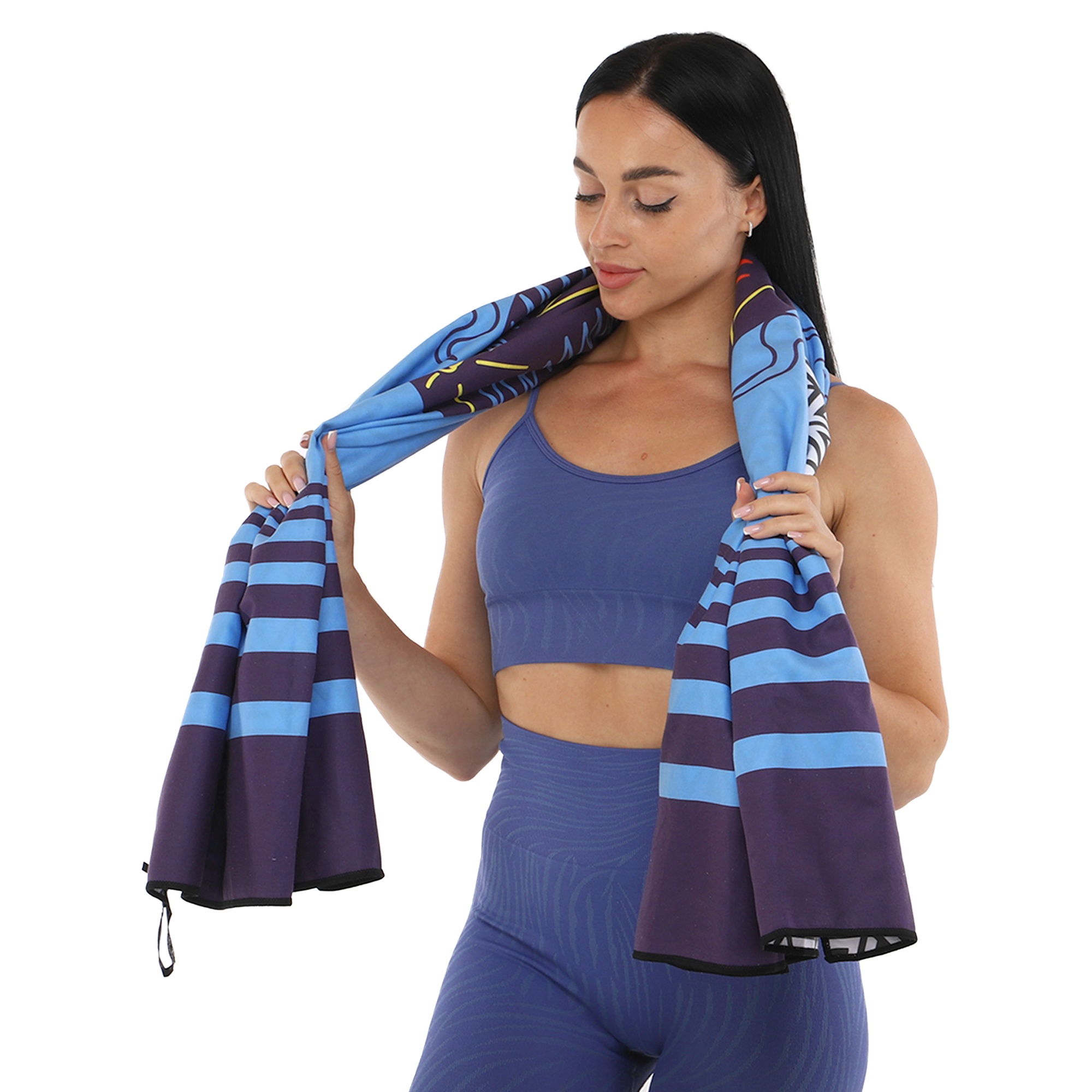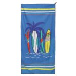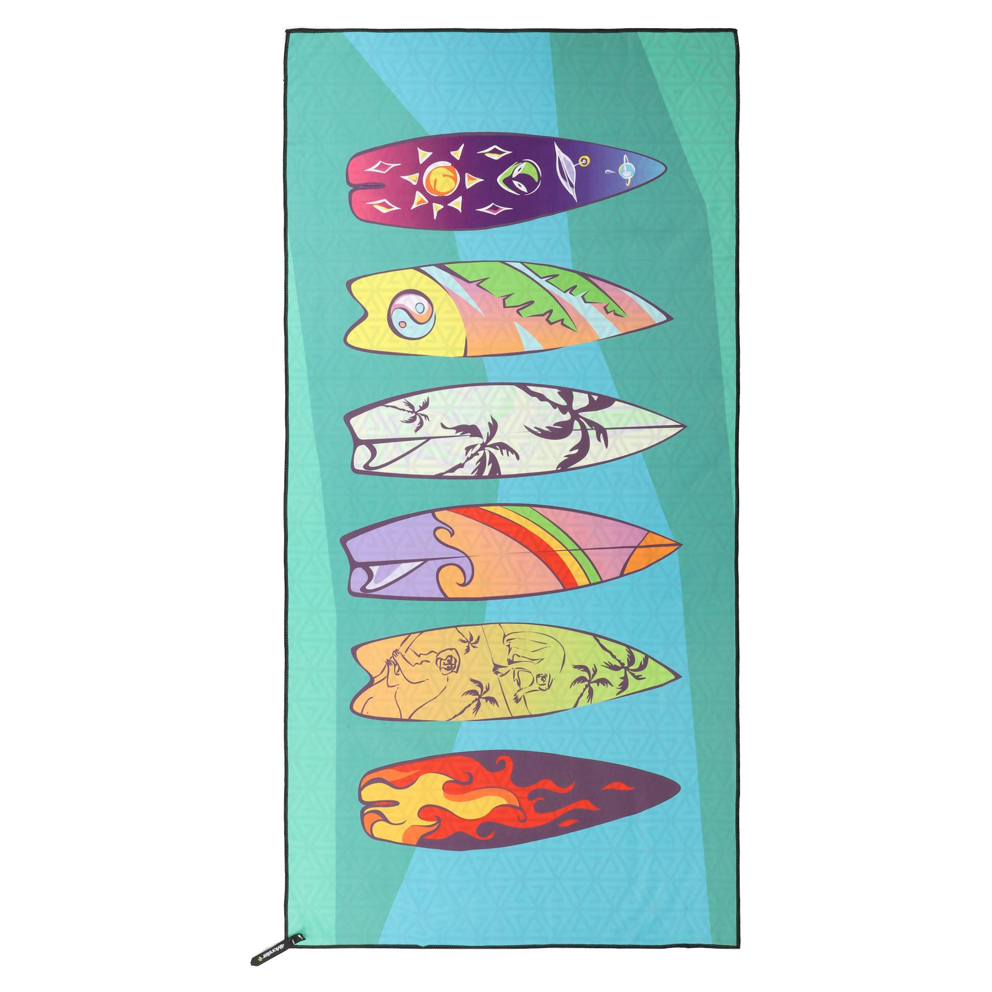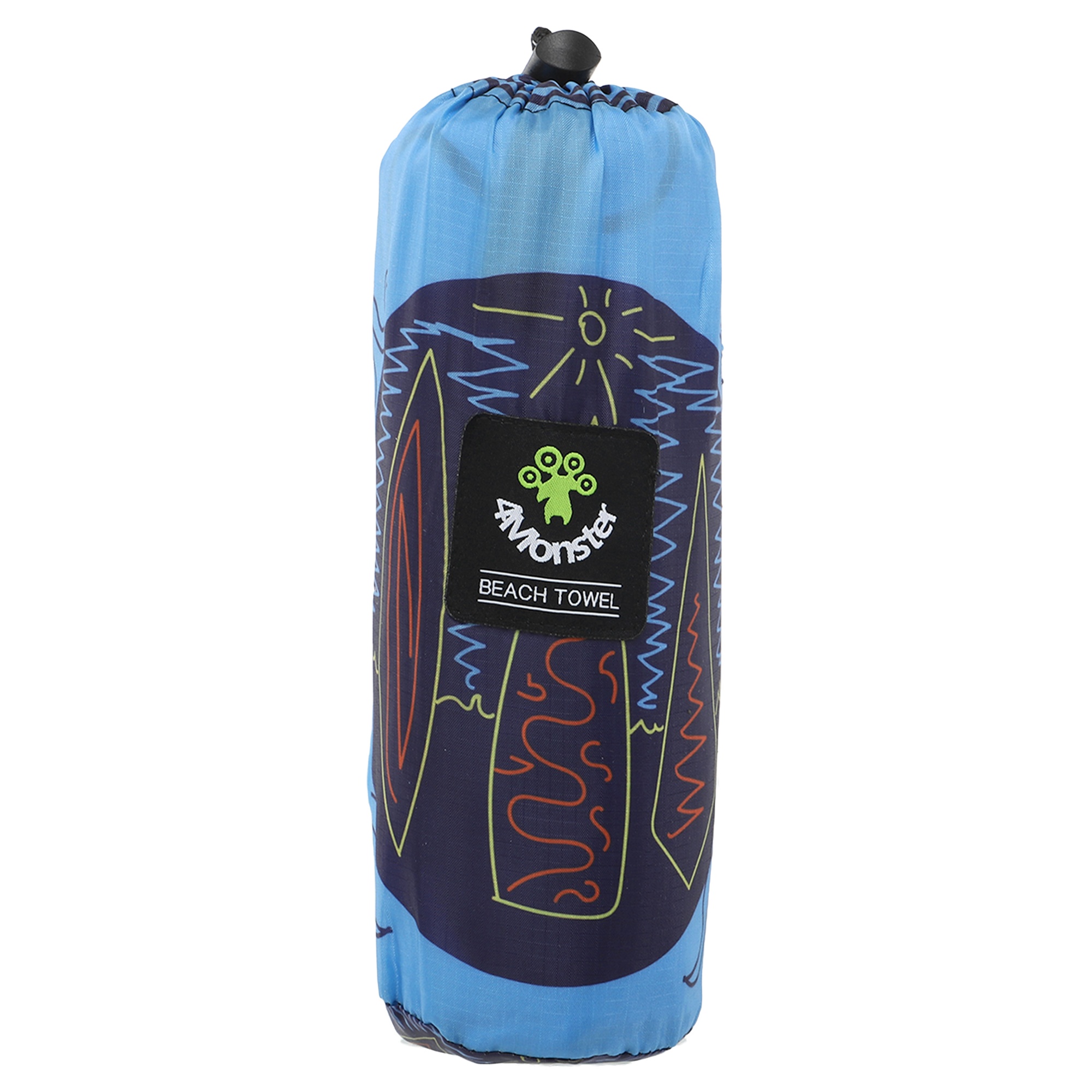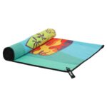 Полотенце для пляжа имеет яркий дизайн. Рисунок нанесен на обе стороны ткани. Для хранения и транспортировки полотенца можно использовать чехол из комплекта. Он изготовлен из водонепроницаемого полиэстера. В чехол-сумку можно сложить даже мокрое полотенце.