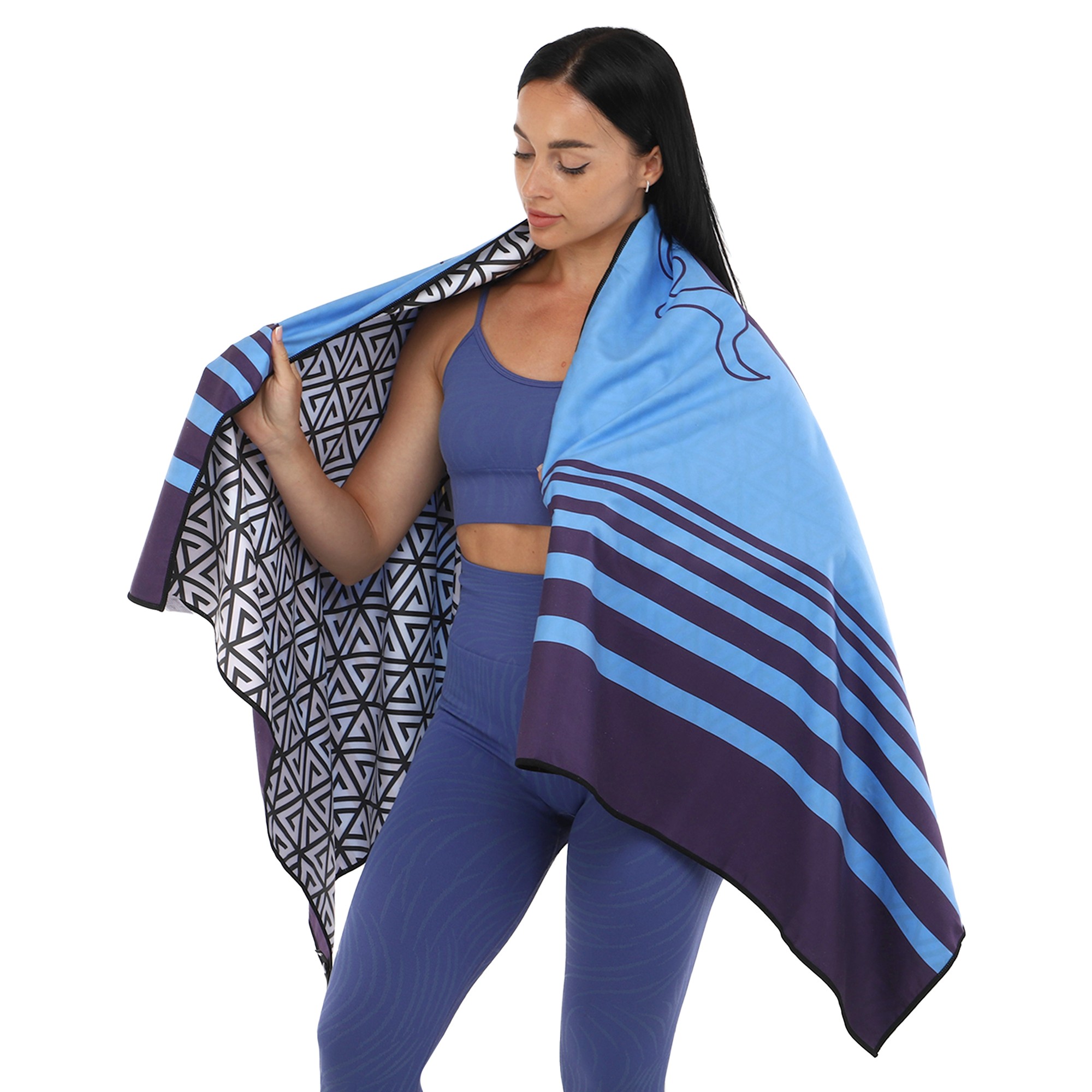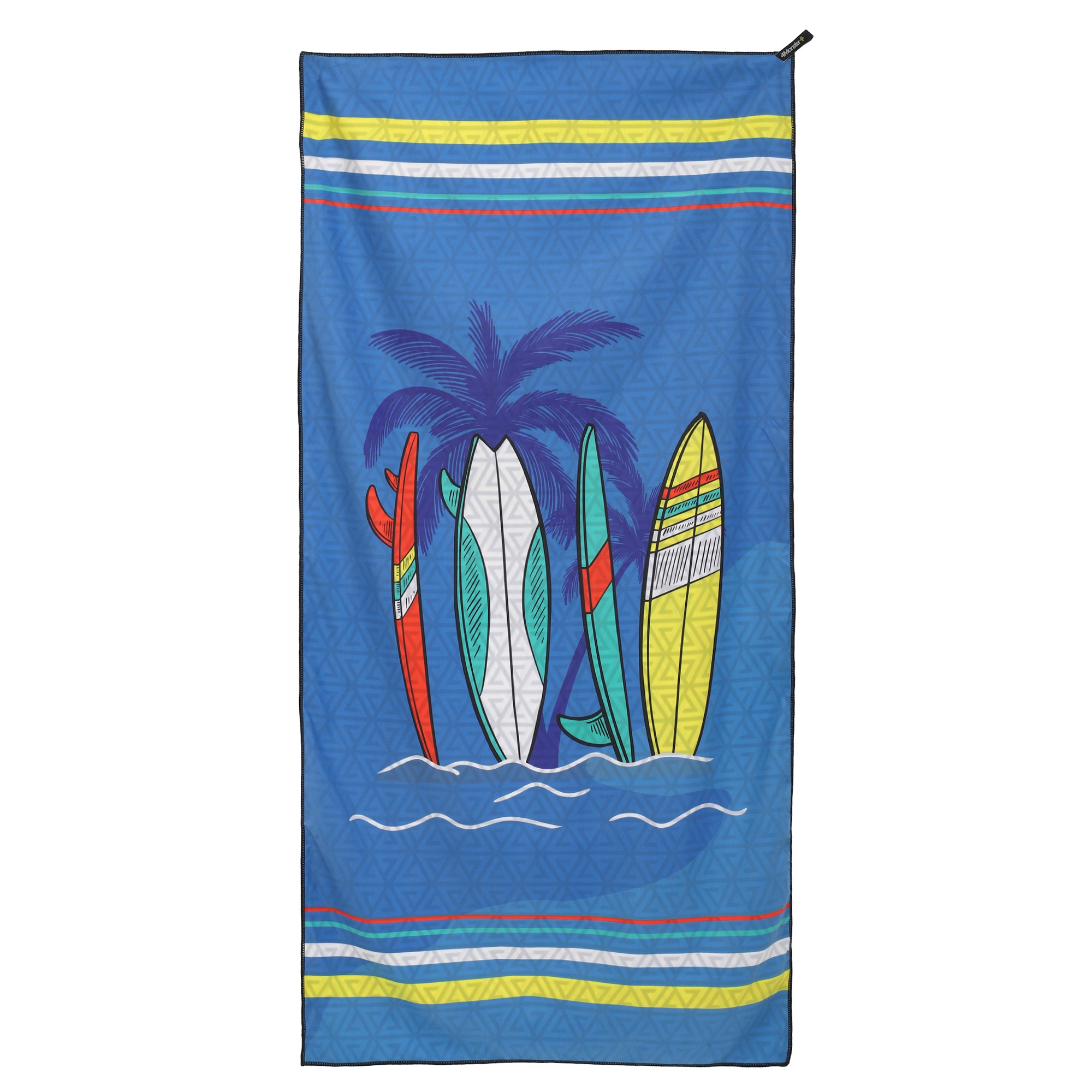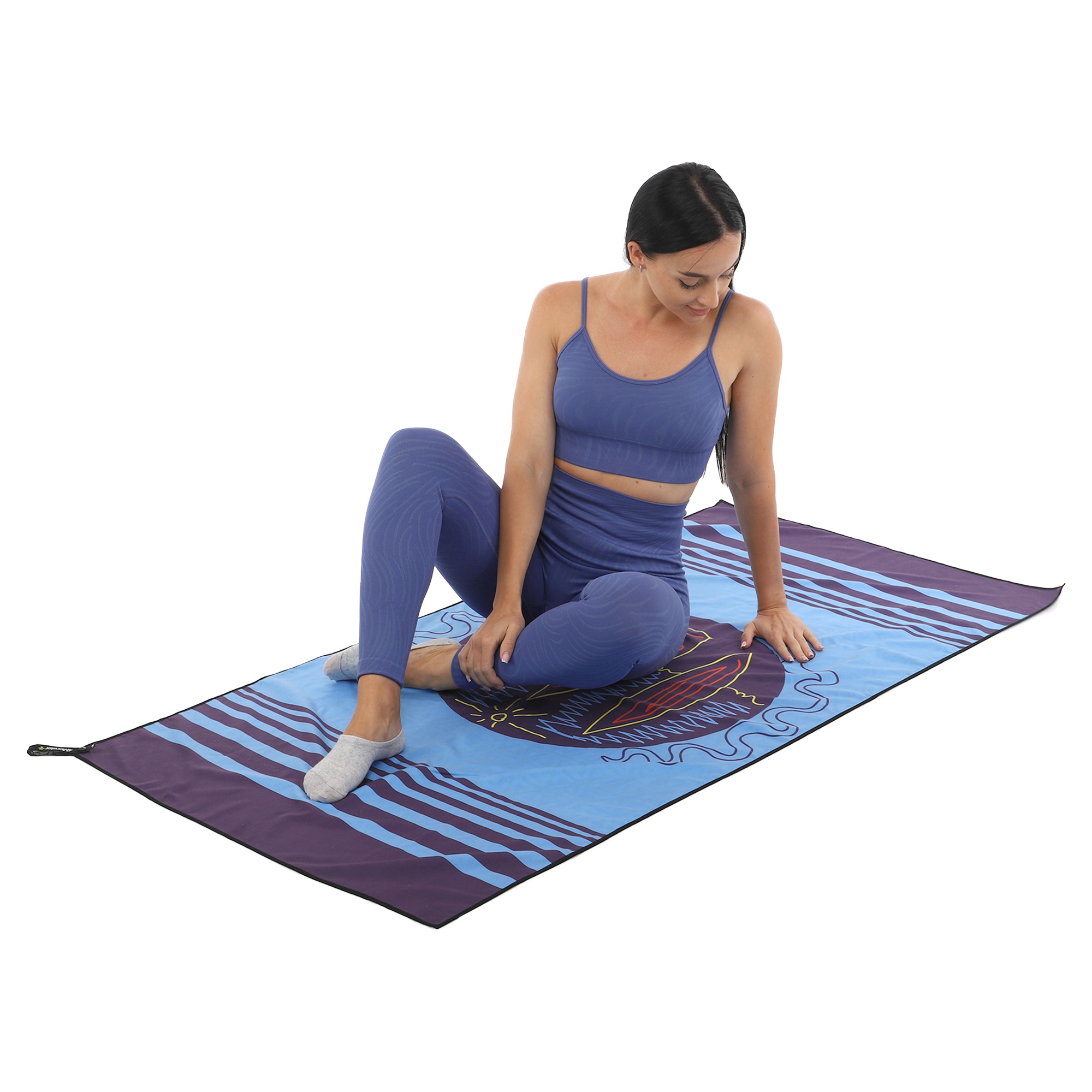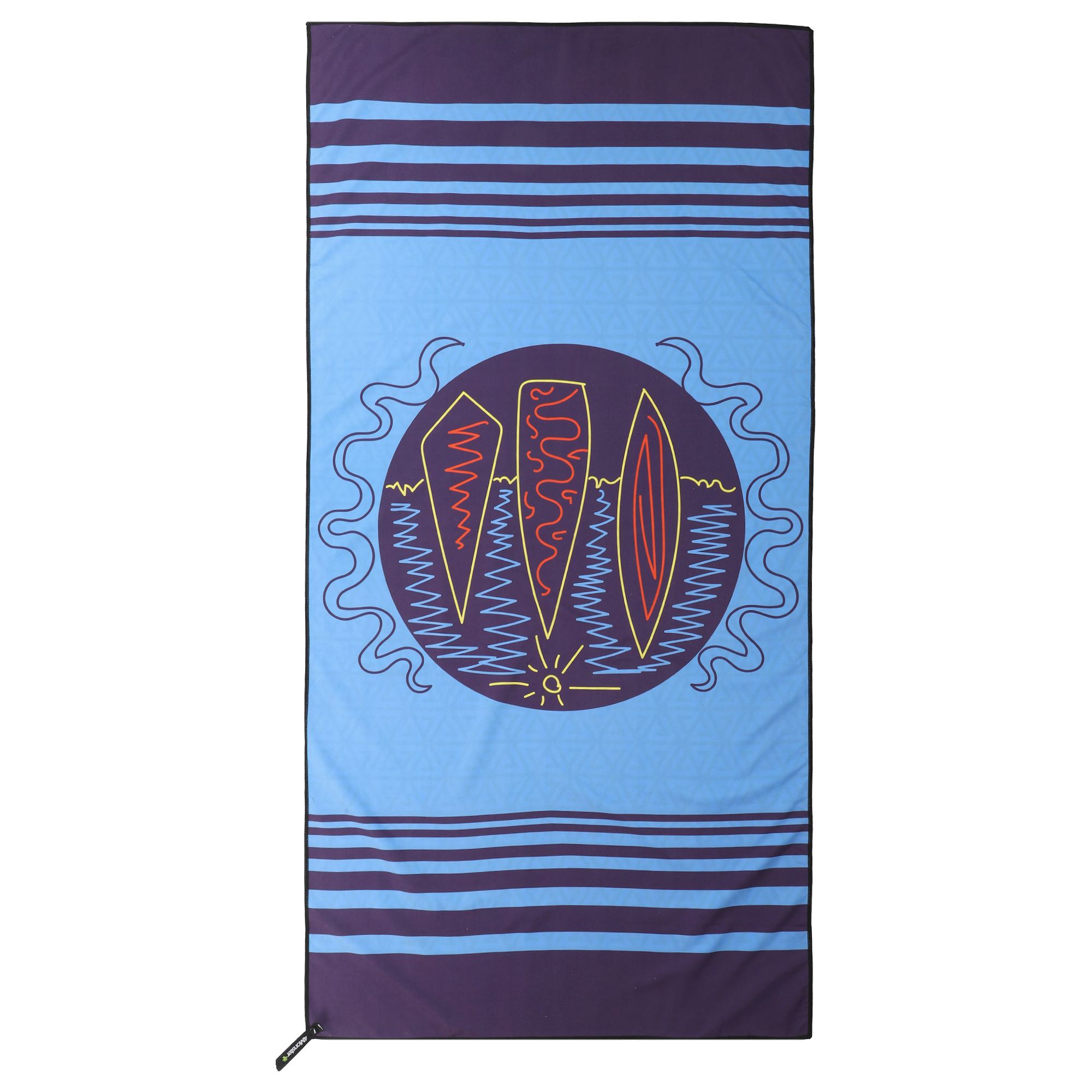Полотенце для пляжа имеет яркий дизайн. Рисунок нанесен на обе стороны ткани. Для хранения и транспортировки полотенца можно использовать чехол из комплекта. Он изготовлен из водонепроницаемого полиэстера. В чехол-сумку можно сложить даже мокрое полотенце.