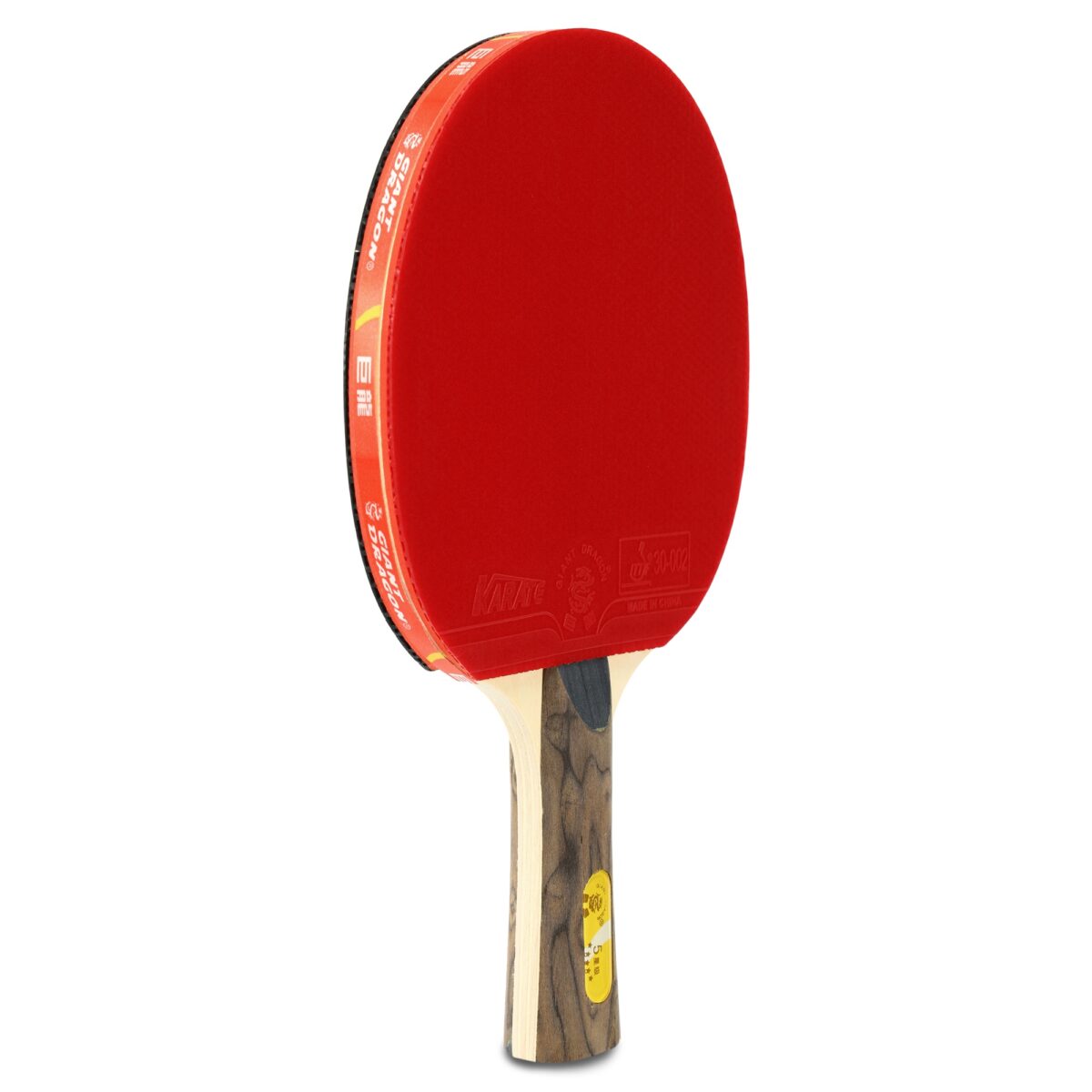 Ракетка изготовлена по технологии термического склеивания, при которой древесный шпон высшего качества склеивается под высоким давлением и высокой температурой. В итоге получается практически монолитное основание, устойчивое к повреждениям и воздействию влаги. На лопасть ракетки наклеены накладки из плотной резины высшего качества и губчатого материала, упругость которого генерирует высокую скорость отскока шарика. Ручка имеет коническую форму, что обеспечивает спортсмену надёжный хват, при котором кисть практически не устаёт во время игры. Для хранения и переноски ракетки предусмотрен чехол, оснащённый замком-молнией.