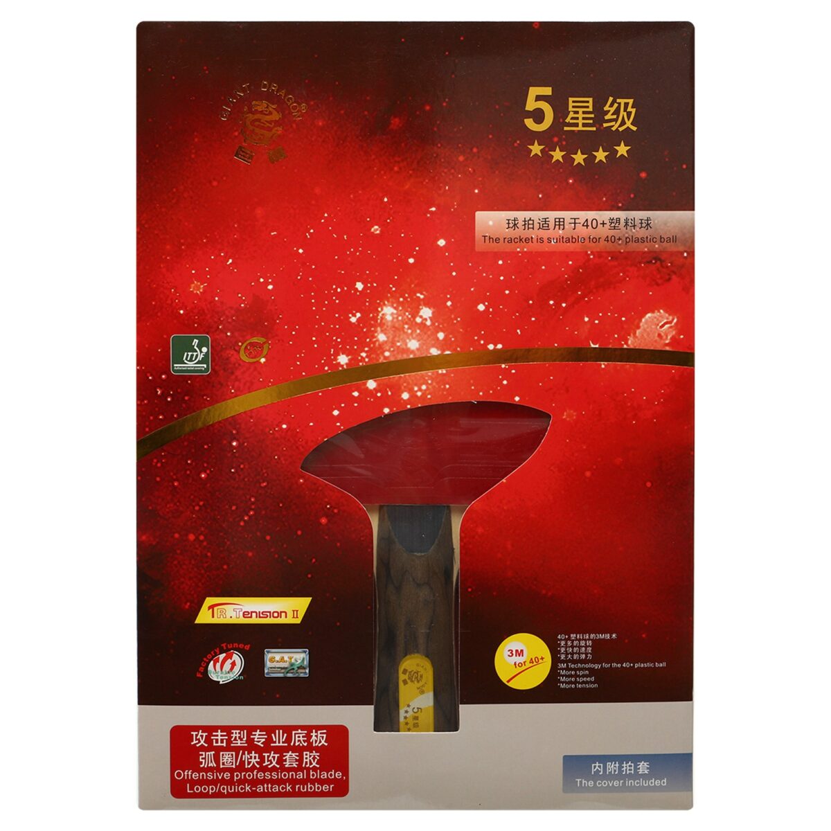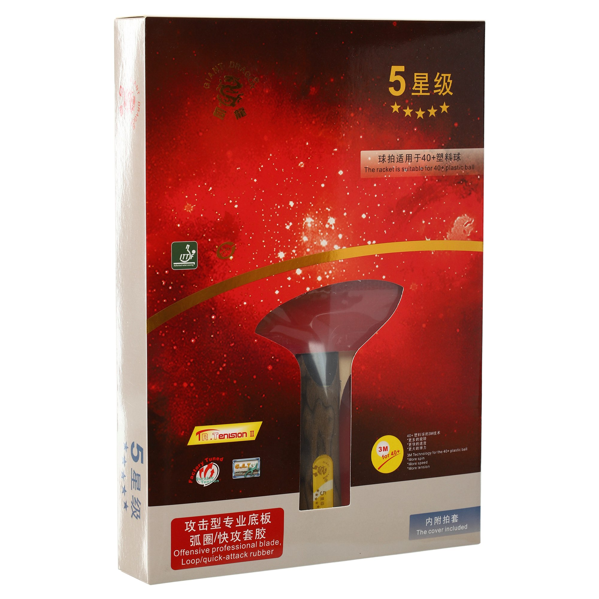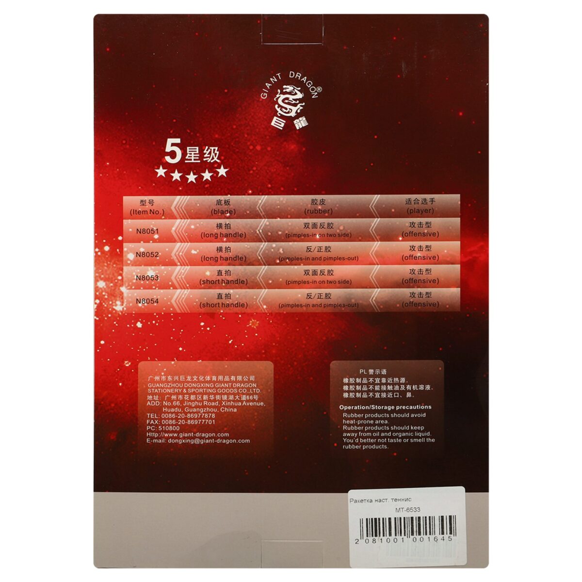 Пятизвёздочная ракетка GIANT DRAGON соревновательного класса относится к категории профессиональных и предназначена для спортсменов, уверенно владеющих техникой игры в настольный теннис. Она характеризуется впечатляющими показателями скорости отскока и вращения шарика, что оптимально для атакующего стиля игры. При этом показатель контроля достаточно высок, чтобы ракетка могла использоваться игроками среднего и даже продвинутого начального уровня.