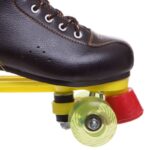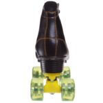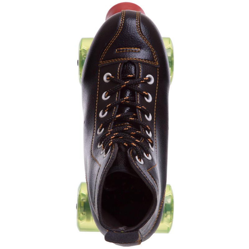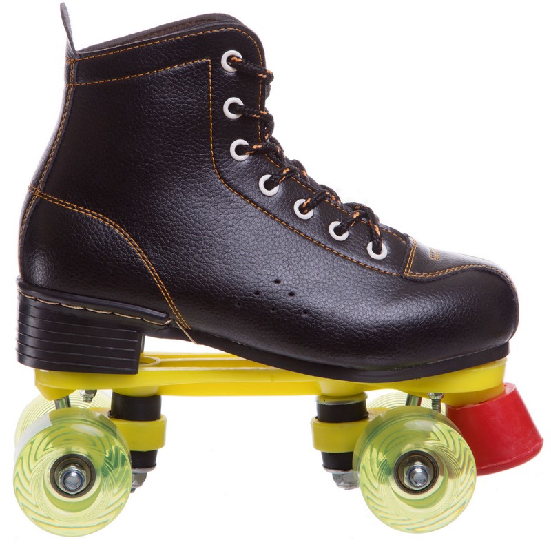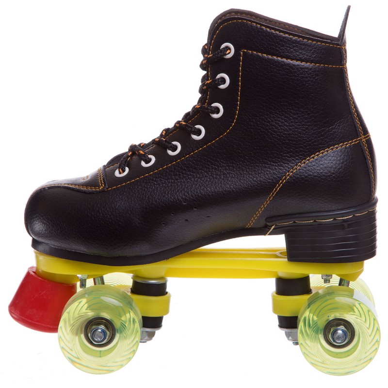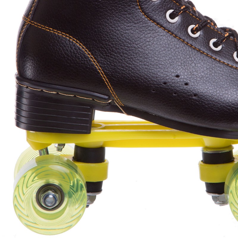 Удобный ботинок выполнен в ретро стиле из синтетической PVC-кожи. Он имеет небольшой каблук, центр тяжести смещен вперед. Для фиксации на ноге используется шнуровка. Платформа роликов (рама) изготовлена из ударопрочного пластика. Она менее прочная чем алюминиевые, но имеет меньший вес, что позволяет кататься без чувства усталости как взрослым, так и детям. На передней и задней оси закреплены по два мягких полиуретановых колеса, диаметром 54 мм. Маленькие колеса делают ролики более маневренными и легко управляемыми. Качественные подшипники класса  ABEC-7 обеспечивают их мягкий и плавный ход. Жесткость колес – 82А. Это мягкие колеса, обладающие хорошими адгезивными свойствами. Они меньше скользят и способны гасить вибрации, сглаживая неровности поверхности. В передней части (на носке) каждого конька расположен жесткий тормоз, позволяющий не только сбавить скорость до полной остановки, но и оттолкнуться от поверхности для плавного начала движения.