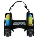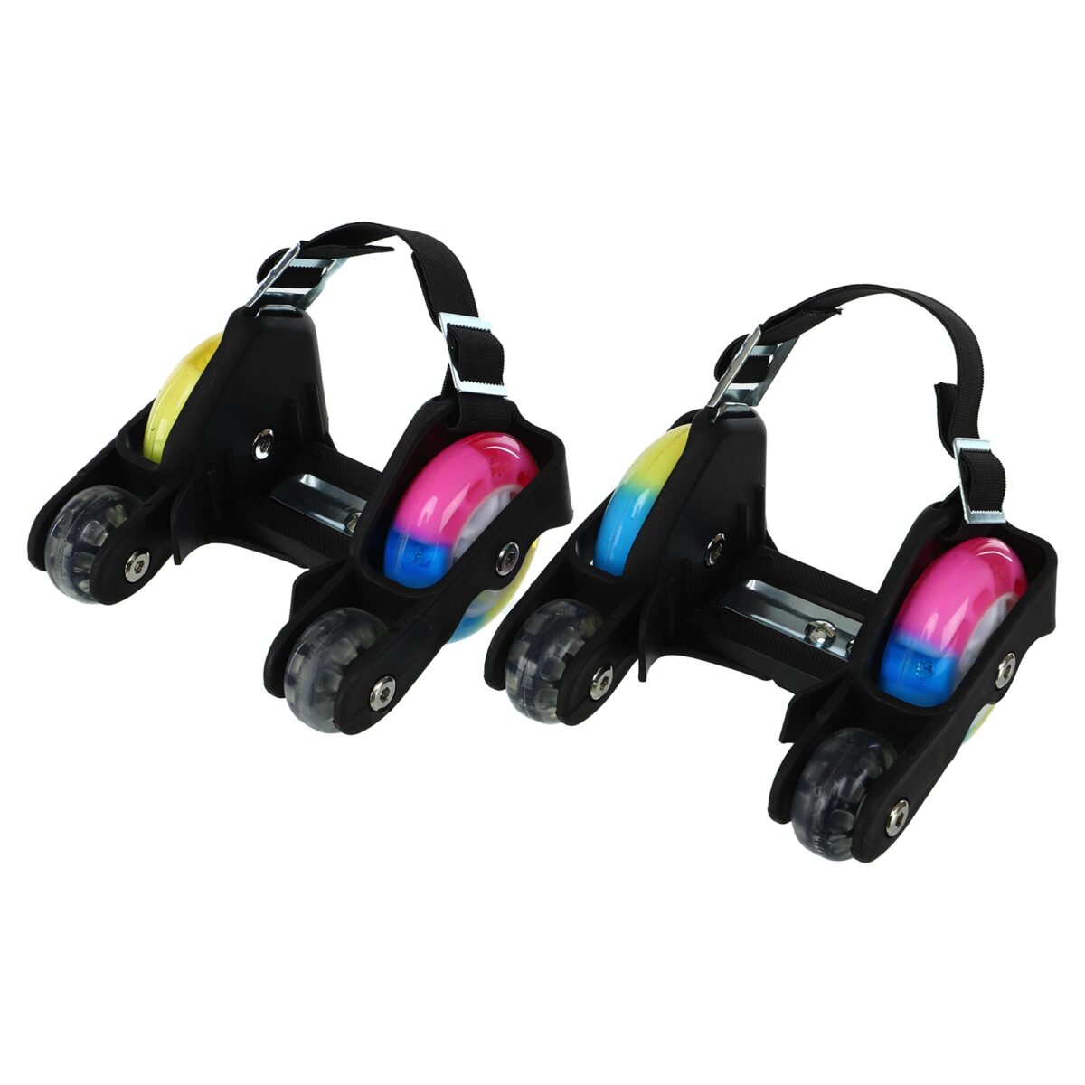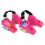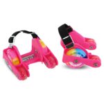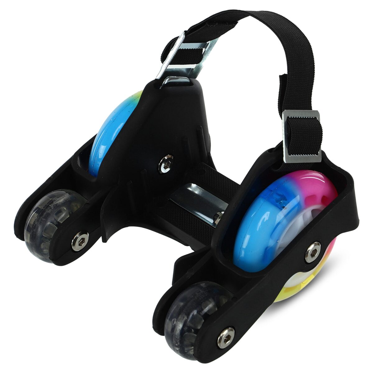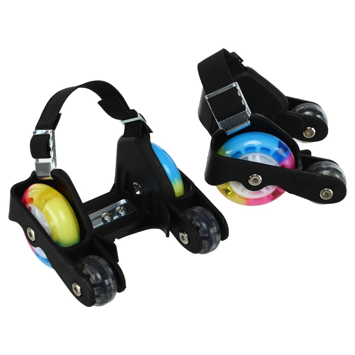 Основная часть конструкции роликов – это раздвижная рама из прочного пластика, которую благодаря специальному механизму можно отрегулировать по ширине практически любого типа обуви с прочной плоской подошвой. На раме закреплены две пары полиуретановых колёс – большие, на которых непосредственно катаются, и поменьше для подстраховки и лучшей устойчивости. Ролики крепятся с помощью регулируемого по длине ремня с металлическим крючком. Такое решение обеспечивает их плотную посадку на ноге. Большие колёса оснащены светодиодной подсветкой, которая переливается разноцветными огнями во время движения.