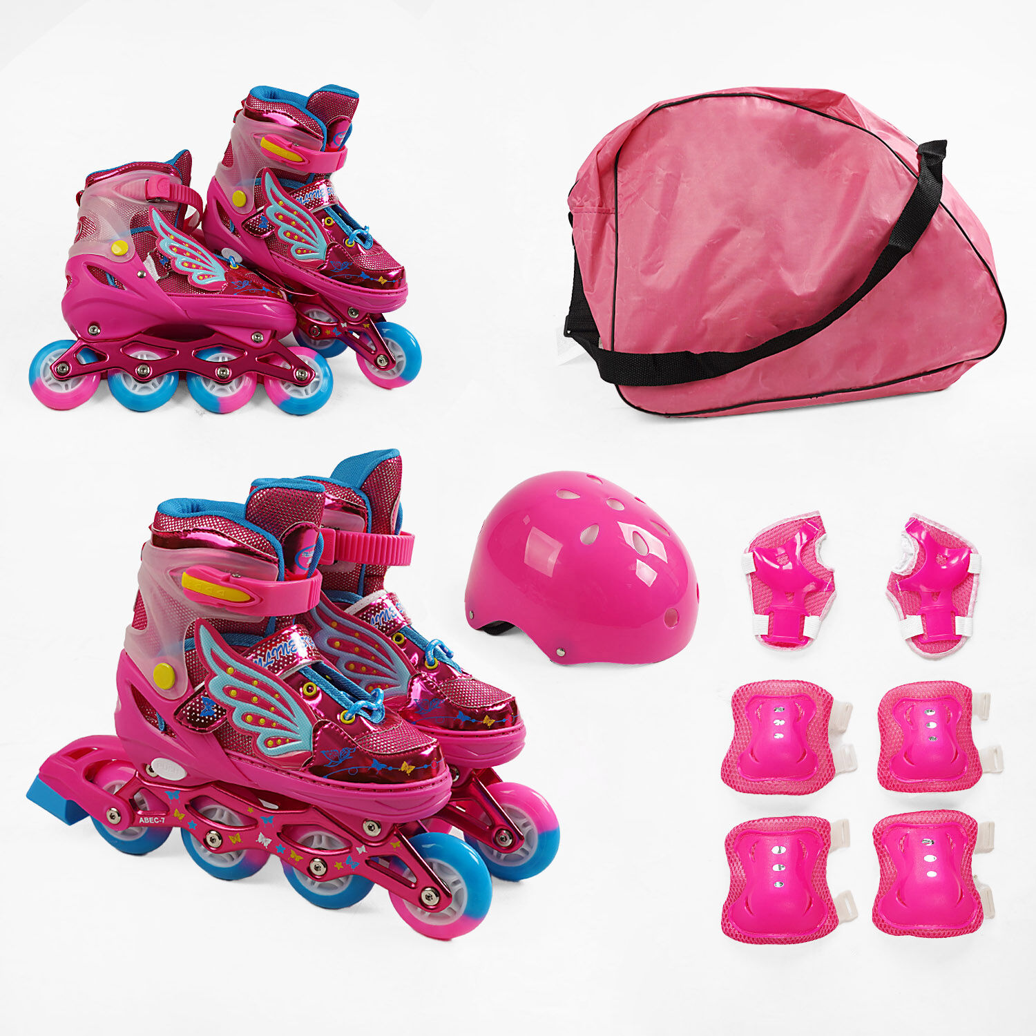 Колёса из качественного полиуретана обеспечивают плавный ход, хорошее сцепление с поверхностью и устойчивость. В комплект также входят защитный шлем и набор защиты для коленей, локтей и запястий, что повышает уровень безопасности.