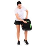 Рюкзак имеет мягкую спинку, регулируемые наплечные лямки, благодаря чему его удобно носить на спине. Повесить изделие на крючок в раздевалке спортзала можно на удобную ручку для переноса в руках. Водонепроницаемое основание защищает содержимое и позволяет ставить рюкзак на пол. Для хранения вещей предназначено одно большое отделение с застежкой-молнией, передний закрытый карман и два боковых кармана из эластичной сетки. В рюкзаке также есть открытое отделение из сетки, предназначенное для транспортировки мокрого полотенца или купального костюма.