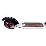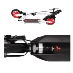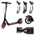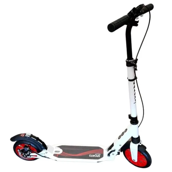 2-х колесный алюминиевый самокат для детей от 7-ми лет, подростков и взрослых. Максимальная нагрузка — 100 кг . Конструкция складная, колеса прорезиненный PU 200мм с принтом, размер деки 34 * 13см, нескользящее резиновое покрытие на противне, высота руля (от пола) регулируется от 86 до 106см (3 положения), ручки резиновые, зажим на руле, передней и задней рессоры, ножной и ручной дисковый тормоз, подстаканник, фонарик, ремень для переноски. Размер коробки — 89 * 29 * 32см