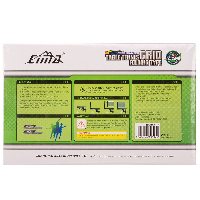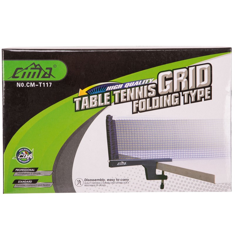 Сетка изготовлена из высококачественного нейлона устойчивого к механическим повреждениям, деформации и влаге. На её торцах имеются металлические разъёмы, которые надеваются на стойки, закрепляемые в креплениях таким образом, чтобы можно было отрегулировать длину сетки. Крепления устанавливаются на стол посредством клипсовых зажимов с резиновыми прокладками, которые обеспечивают надёжную фиксацию. Также они предохраняют поверхность стола от царапин. Для хранения и переноски сетки предусмотрен чехол из поливинилхлорида с замком-молнией и удобной ручкой.