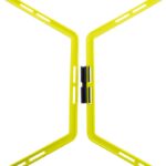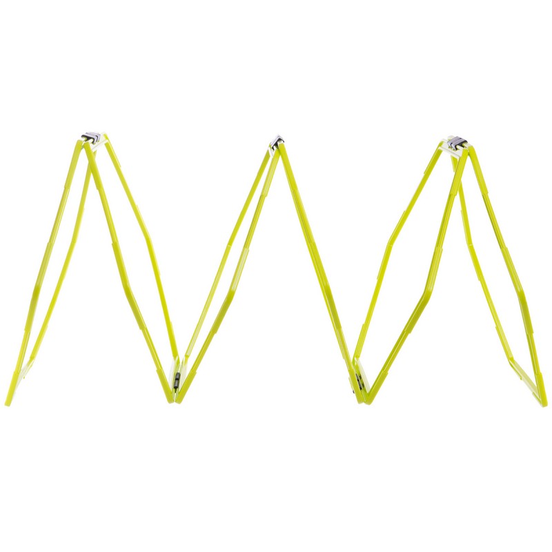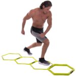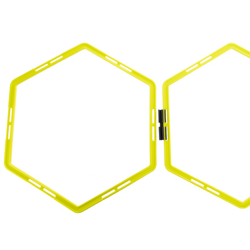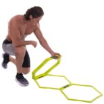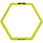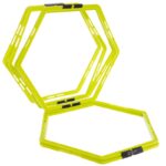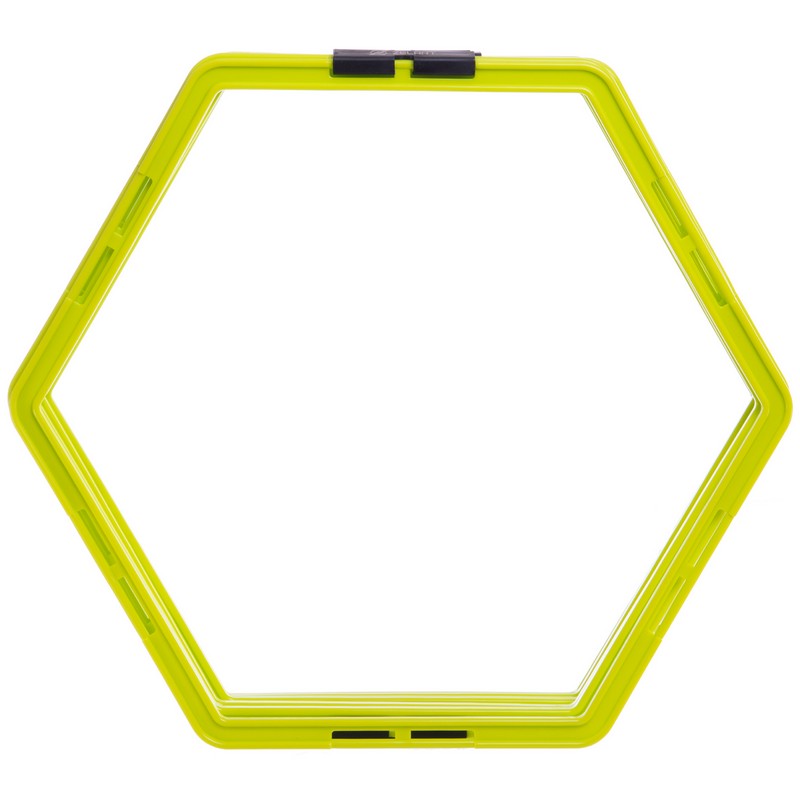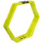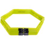 Скоростная лестница от бренда состоит из 6 гексагональных колец, которые соединяются между собой в единую конструкцию с помощью пластиковых креплений. Сами кольца изготовлены из полипропилена и окрашены в салатовый цвет для лучшей видимости. Кольца обладают высокой прочностью и устойчивостью к механическим повреждениям: если в процессе тренировки спортсмен случайно наступит на одно из них, конструкция не сломается. При этом в случае падения на кольца вероятность получения травмы минимальна. После тренировки кольца можно сложить до компактного размера, поместив их одно на другое. Это позволяет сэкономить место для хранения и удобно транспортировать тренажёр.