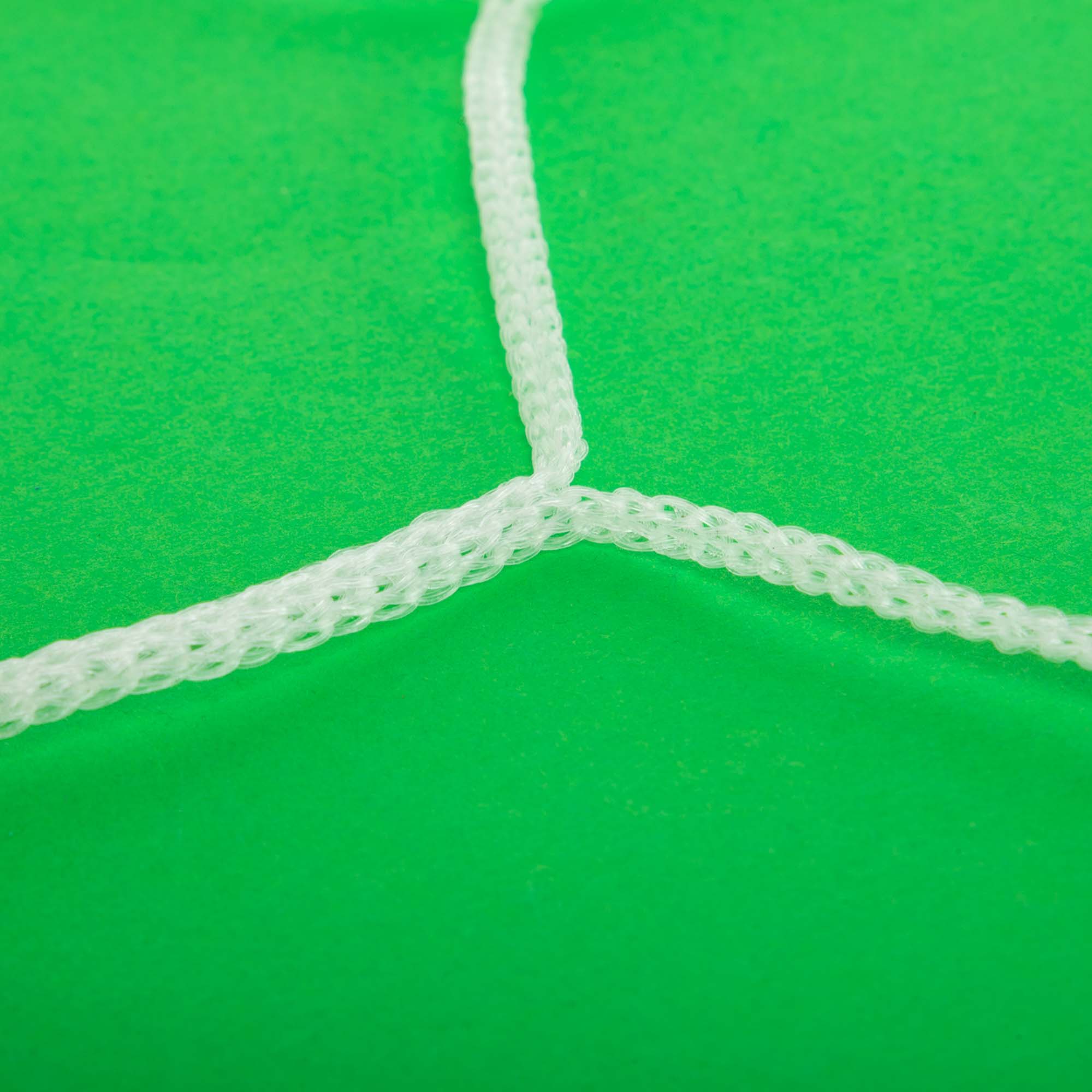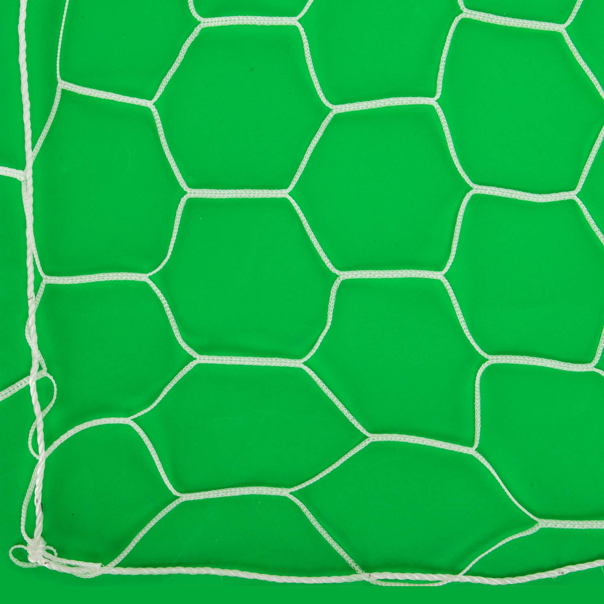Плетение выполнено по безузловой технологии, что исключает вероятность развязывания узлов и увеличивает срок службы изделия. Сетка проста в установке, а ее размеры (7,5 м в ширину, 2,5 м в глубину, 1,48 м в высоту) соответствуют стандартам для футбольных ворот, что делает ее универсальной для большинства площадок.