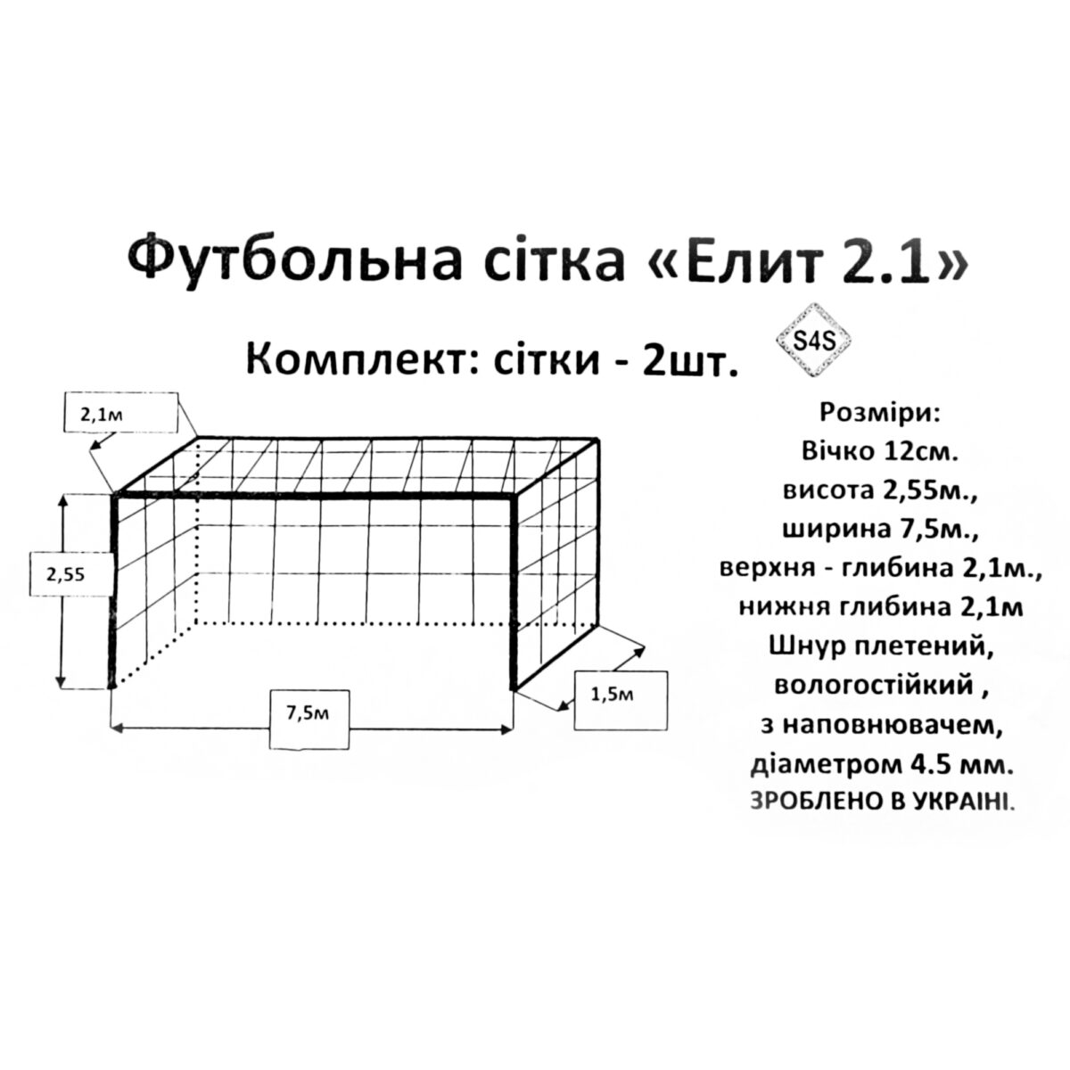 Сетка для футбольных ворот Элит 2,1 изготовлена из крученого полипропиленового шнура толщиной 4,5 мм. Она имеет большой запас прочности и подходит для тренировок спортсменов разного уровня. Даже самые мощные удары взрослых футболистов сетка с легкостью выдержит. Изделие изготовлено методом узлового плетения. Дополнительную прочность спортивного инвентаря гарантирует усиление по периметру выполненное в виде полипропиленового шнура.