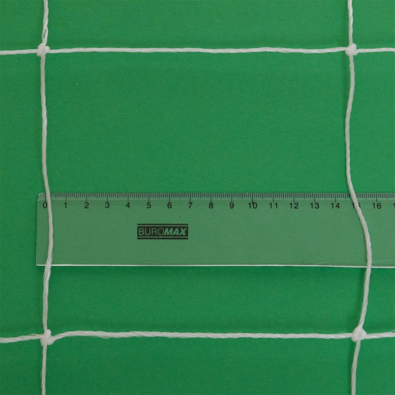 Сетка изготовлена узловым методом. Однако полиэтиленовый шнур не повреждает поверхность мяча при контакте с сеткой. Размер ячейки квадратной формы составляет 14х14 см.