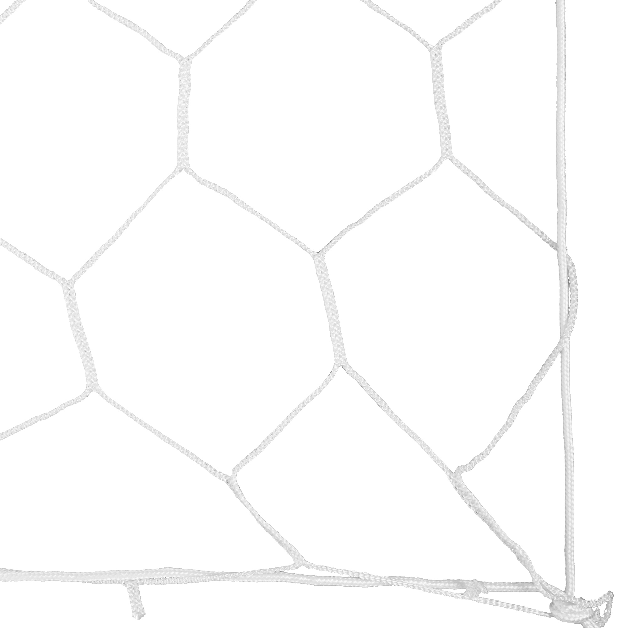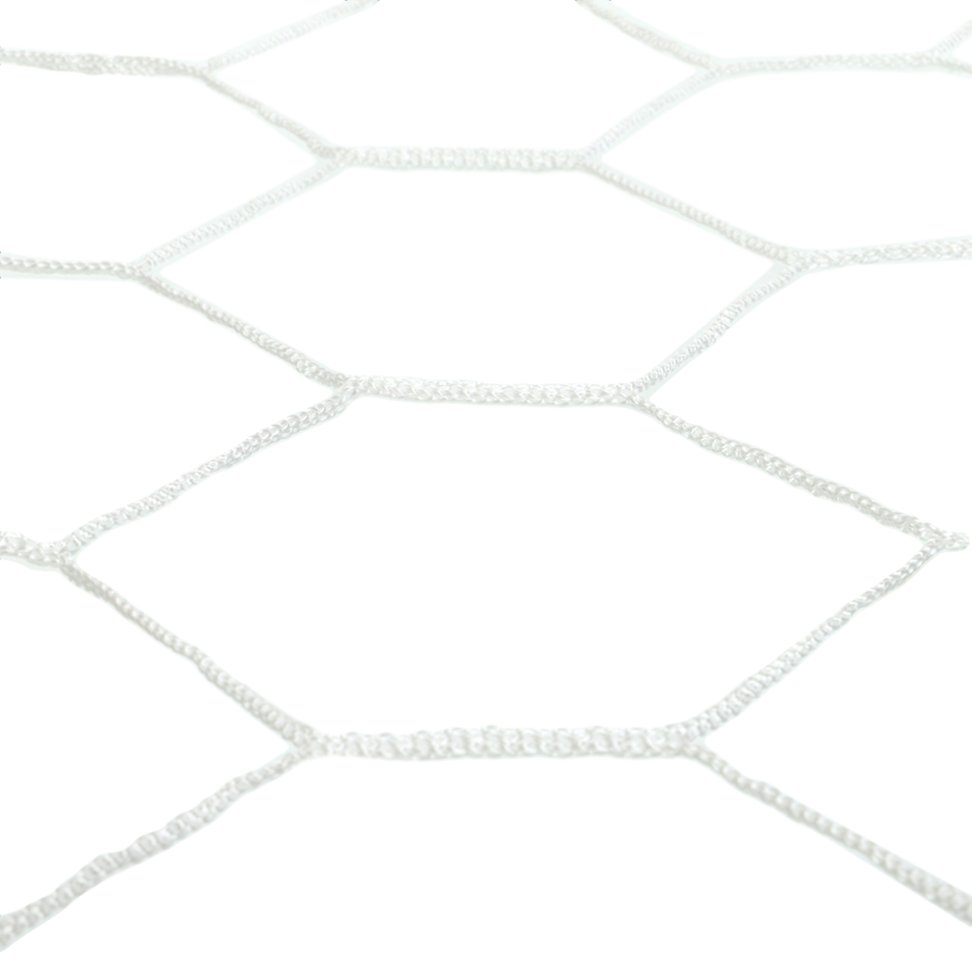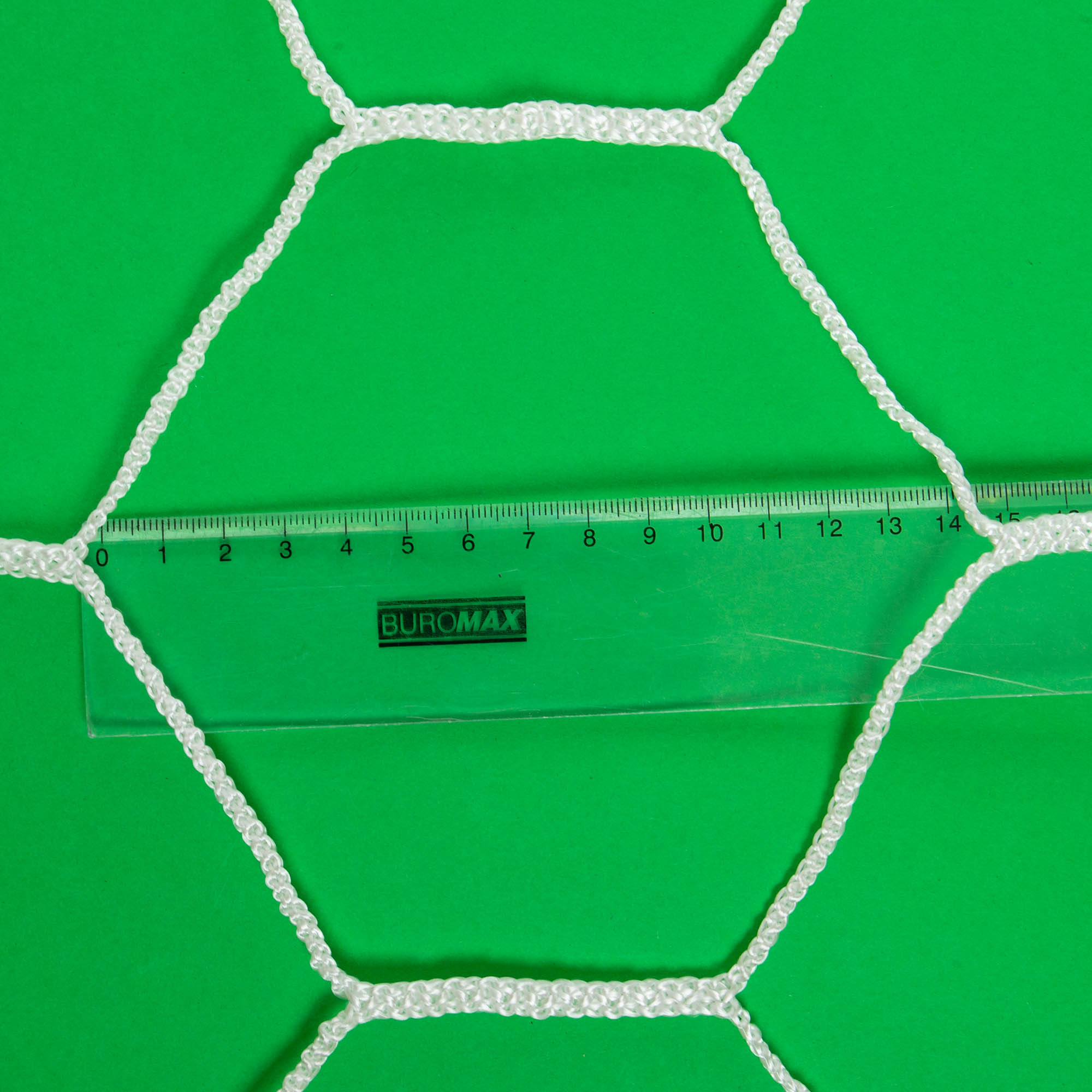 Толщина шнура составляет 2,5 мм, что делает сетку особенно прочной без увеличения её веса. Форма ячейки в виде шестиугольников размером 14×14 мм способствует оптимальному воздухообмену, что снижает сопротивление ветра и улучшает устойчивость сетки на воротах во время тренировок.