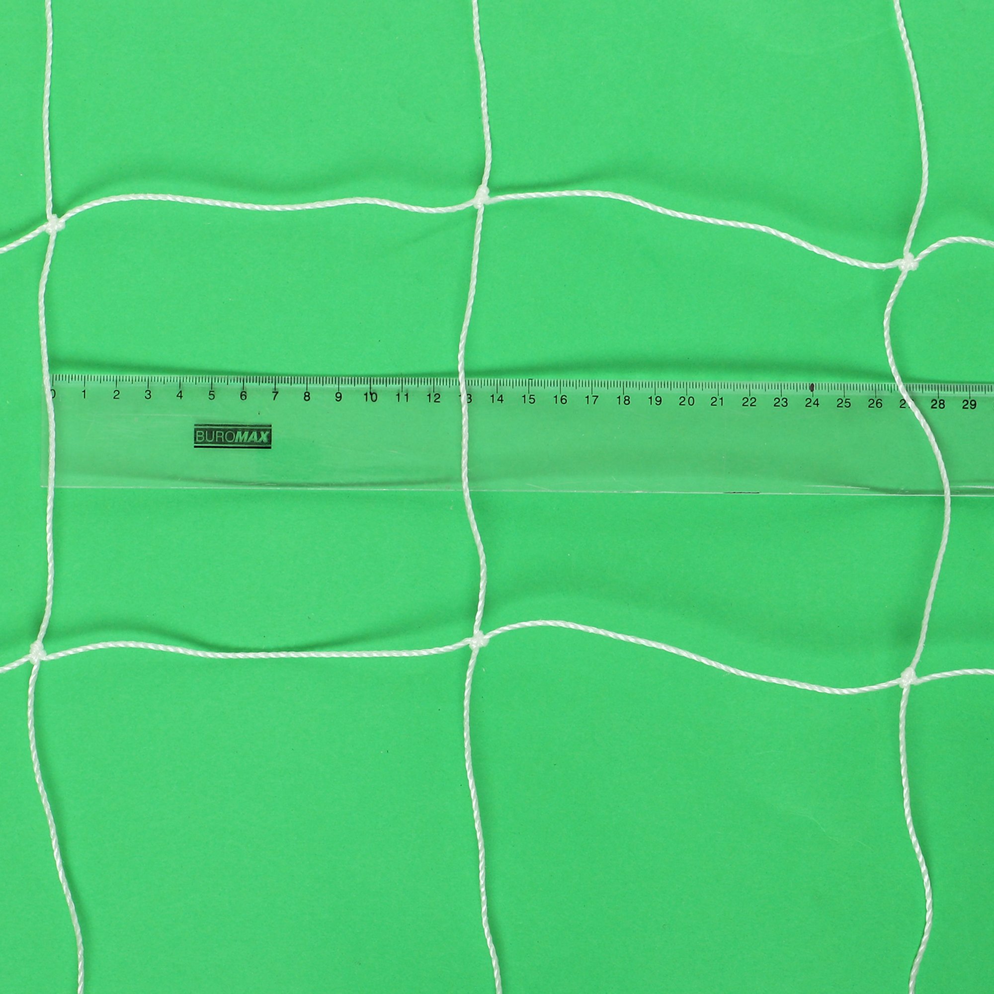 Сетка для футбольных ворот изготовлена из полиэтилена. Синтетический материал отличается устойчивостью к воздействию влаги и ультрафиолетовых лучей. Это позволяет использовать сетку такого типа на любых футбольных полях при любых погодных условиях. Толщина шнура составляет 1,5 мм. Изделие с таким запасом прочности отлично подойдет для школ, секций, любительских и детских тренировок.