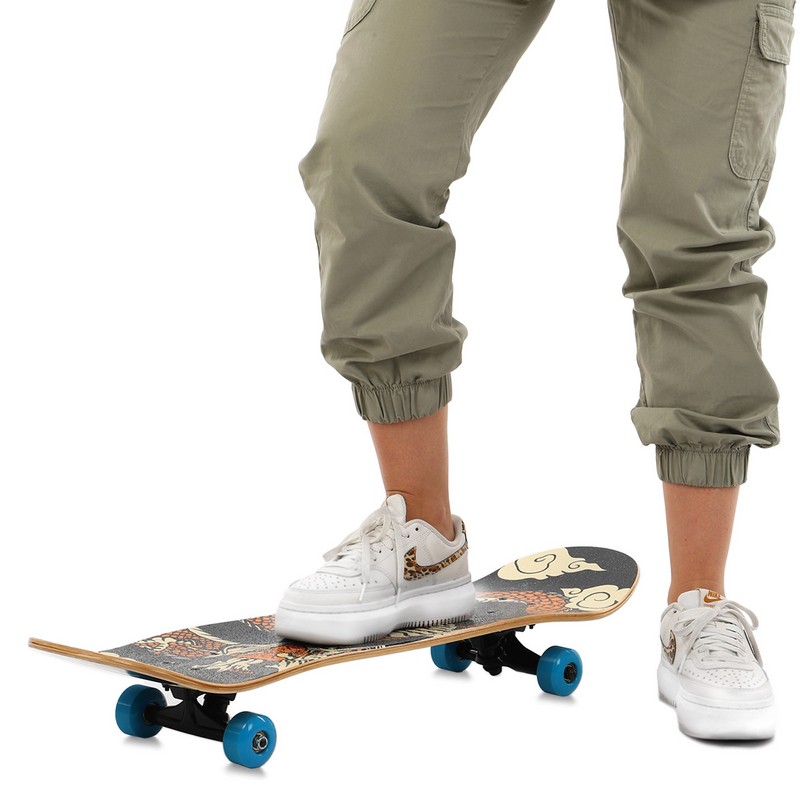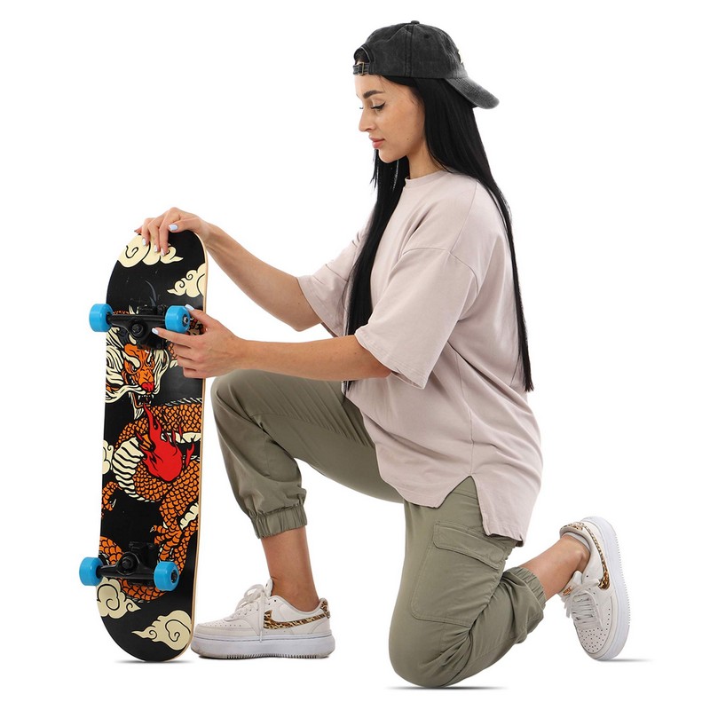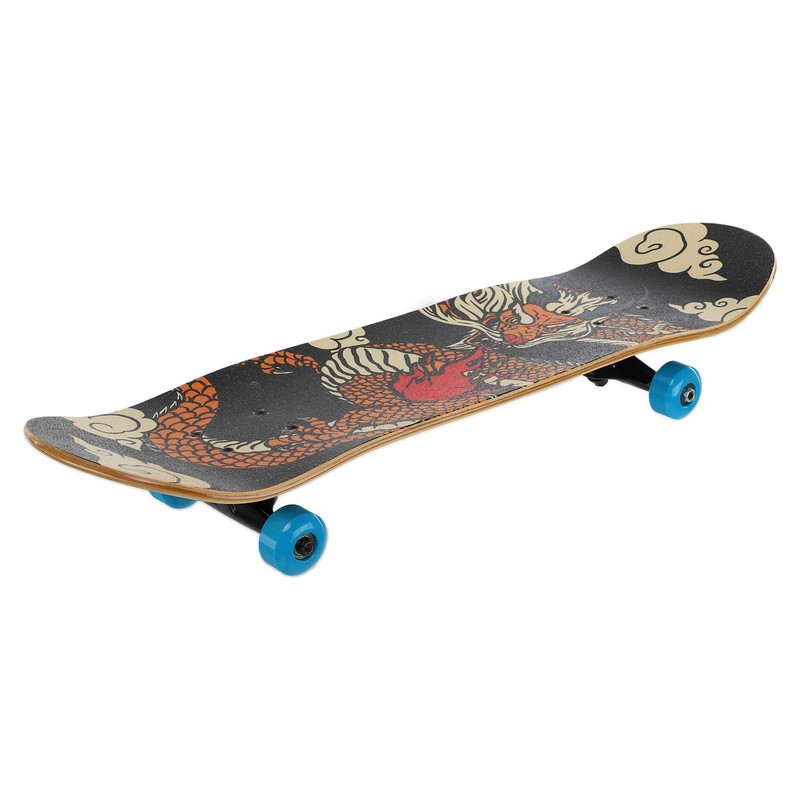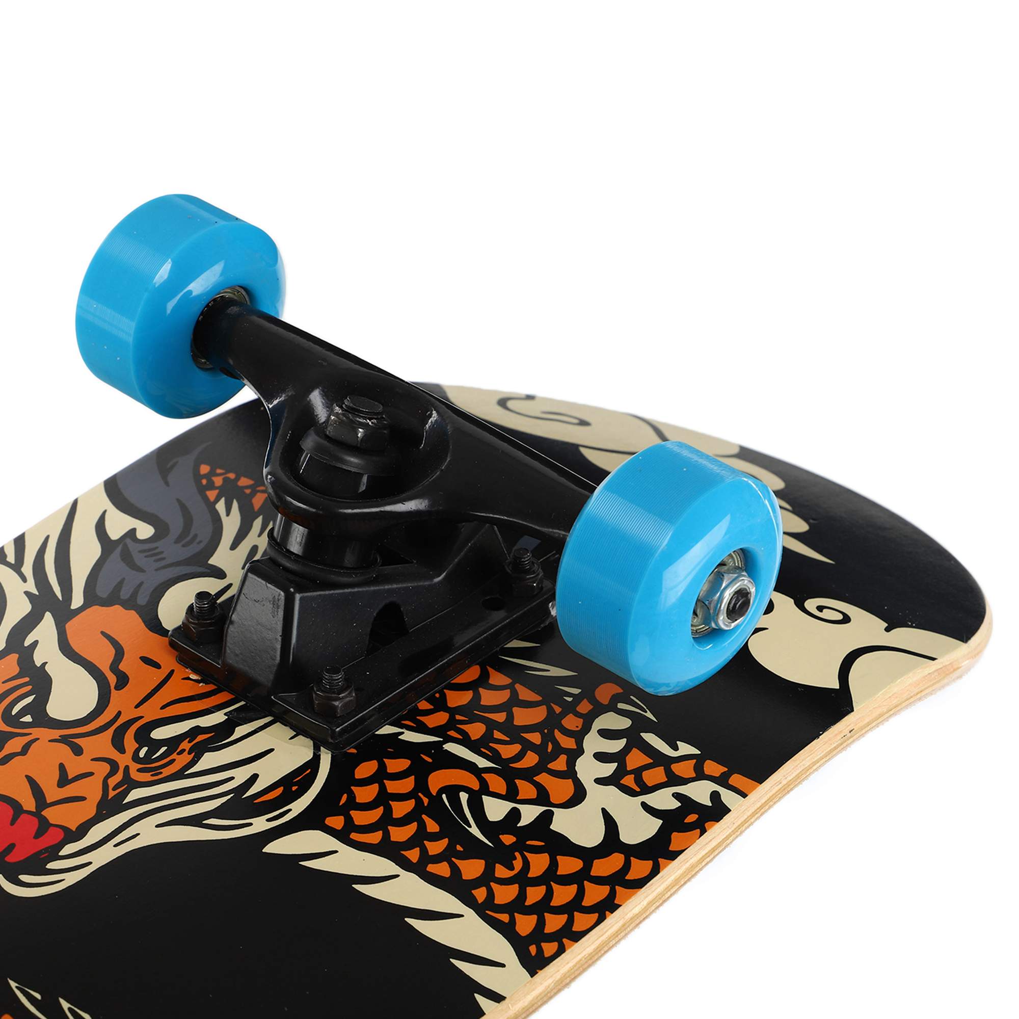 Длина доски составляет 80 см. Диаметр колес из полиуретана — 55 мм. Подшипники типа ABEC 9 обеспечивает практически бесшумное вращение колес. Это подшипники среднего уровня, которые могут использовать как начинающие, так и более опытные скейтбордисты. Им не требуется специальный уход.