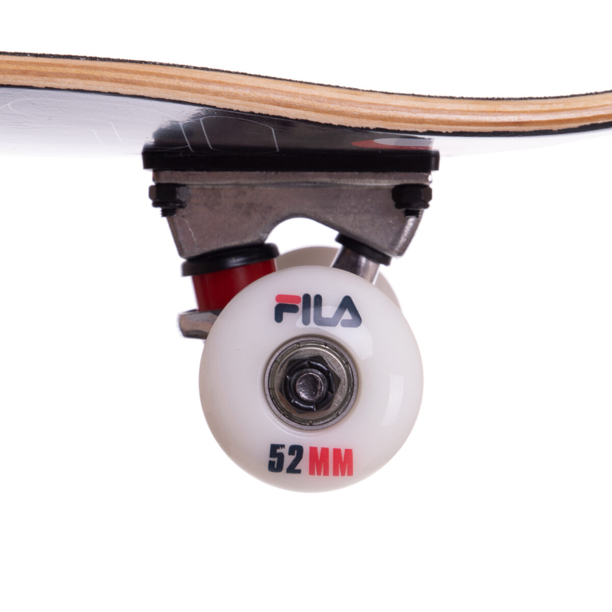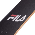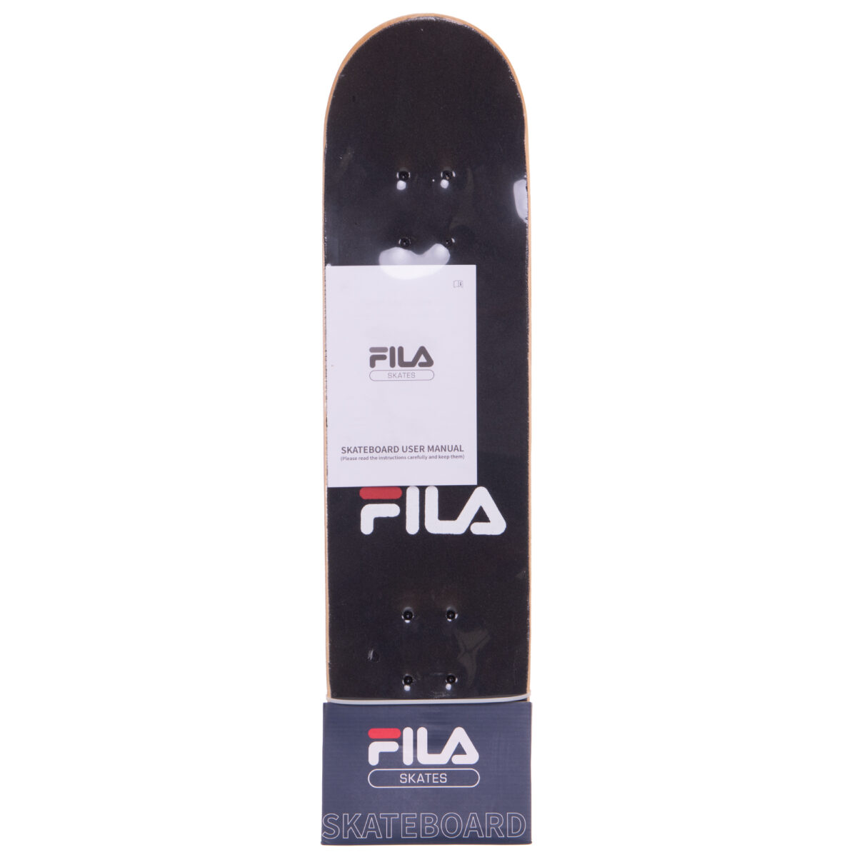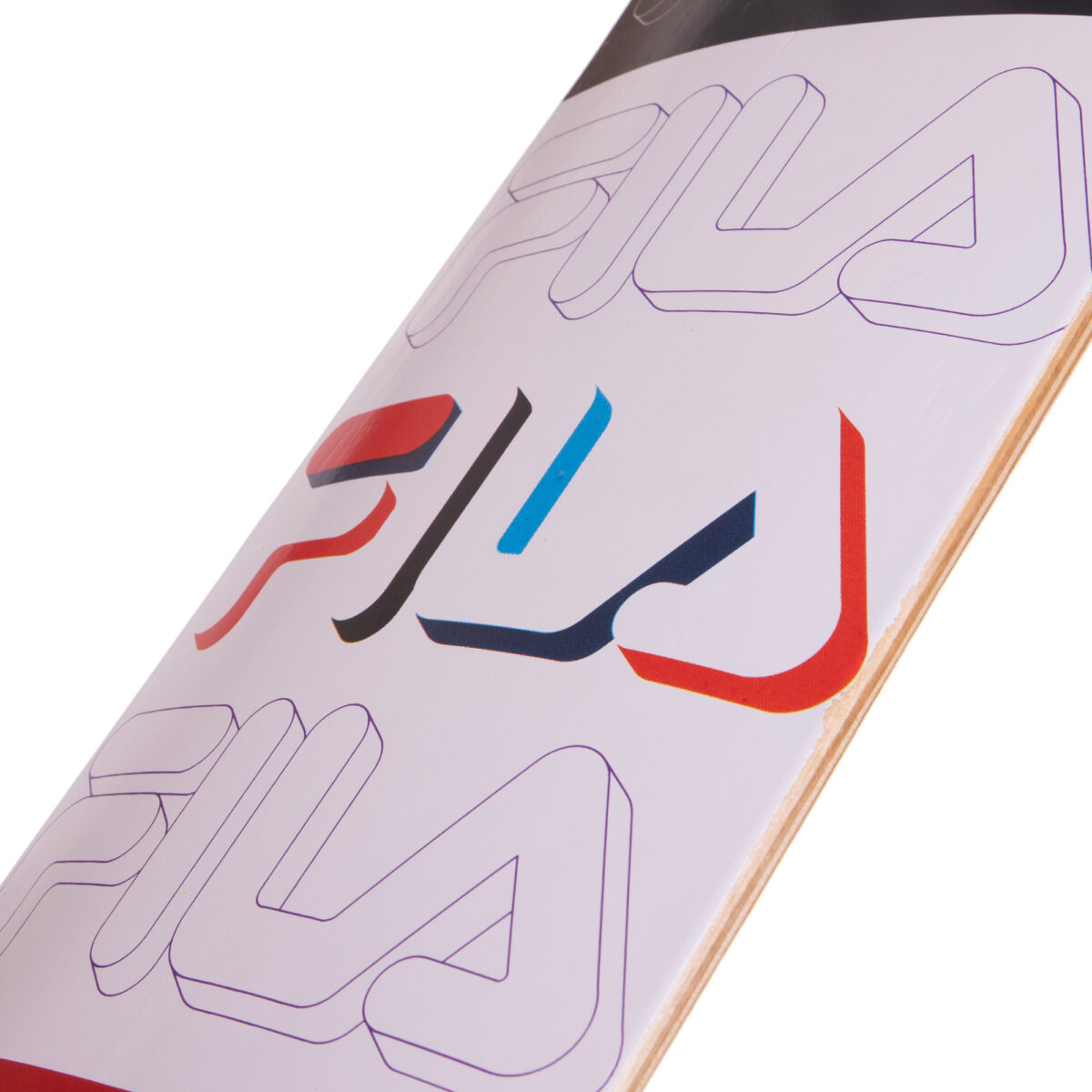С обеих сторон деки нанесены логотипы FILA. Дизайн доски яркий, выполнен в цветах бренда.