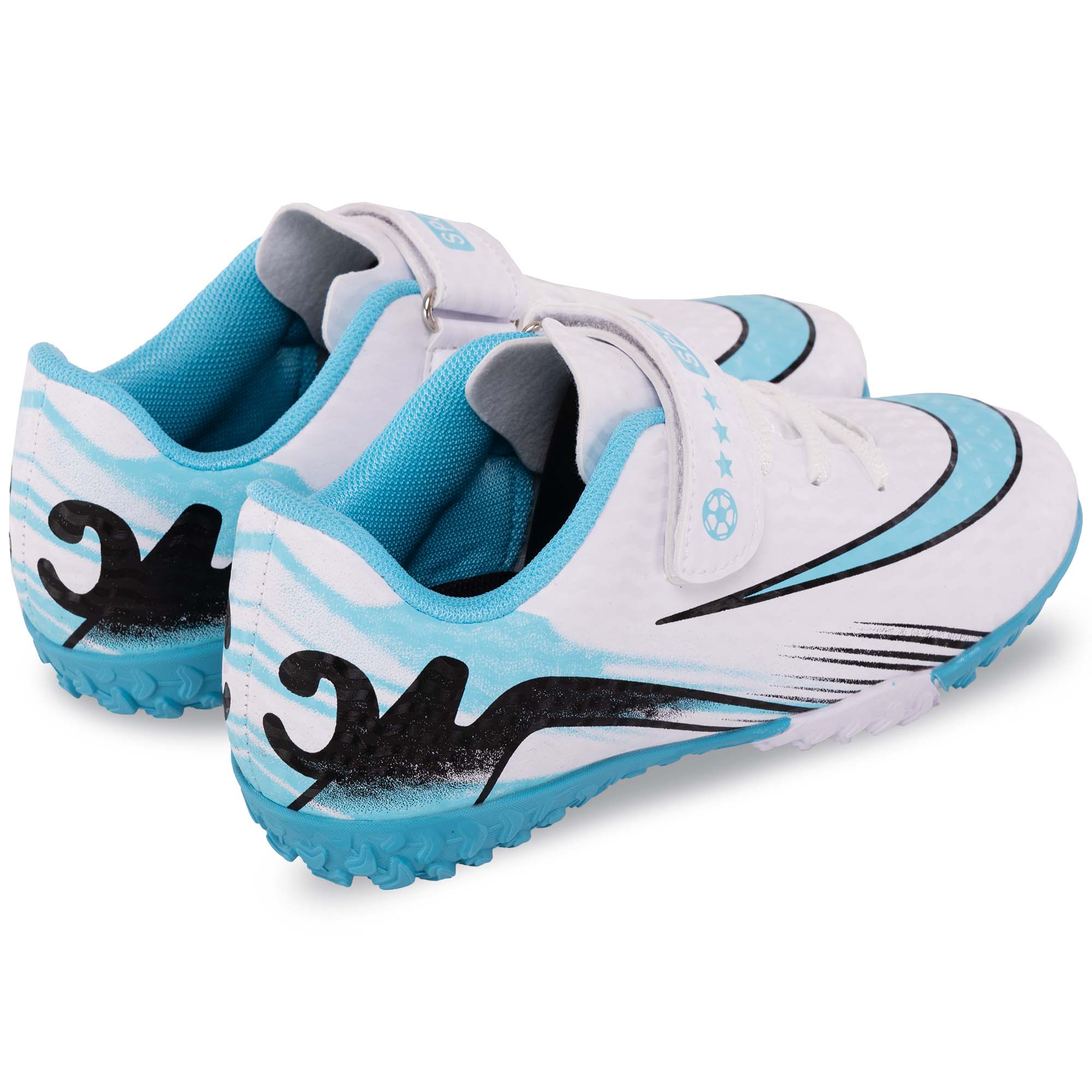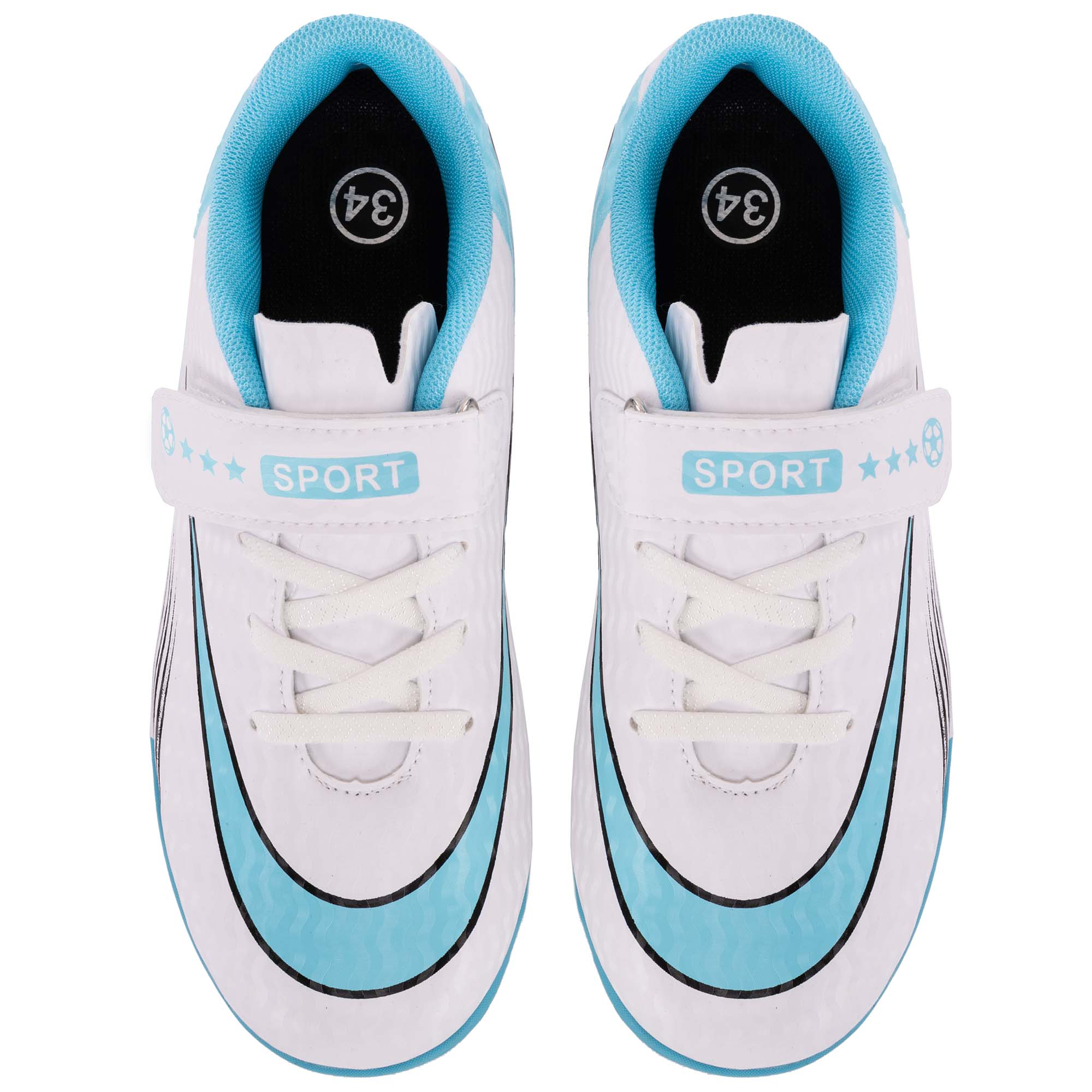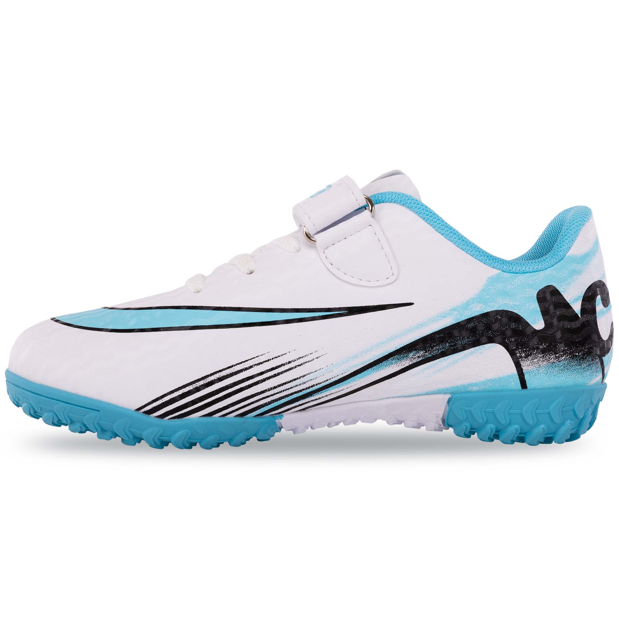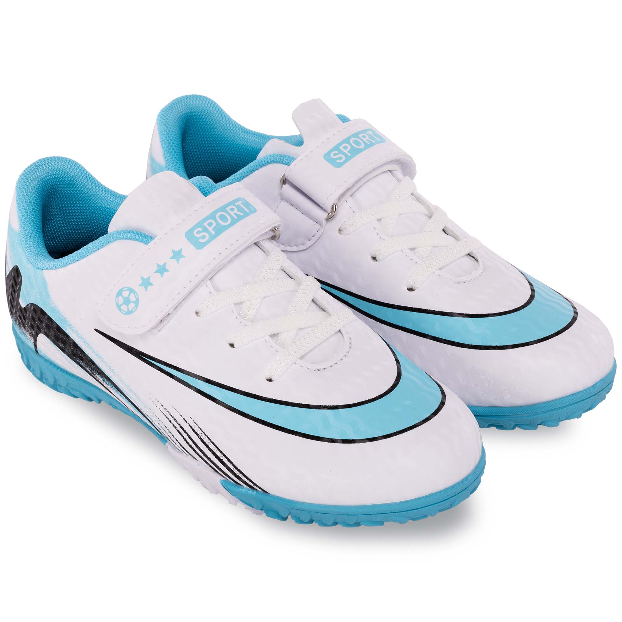 Профессиональная футбольная обувь, которая подойдёт для самых юных футболистов. Чтобы ребёнку было проще надевать обувь, помимо шнуровки на ней присутствует также липучка. Шнуровка позволит точно подогнать обувь по посадке, а липучка обеспечит надёжную фиксацию. Обувь выполнена в приятном бело-голубом цвете и имеет стильный дизайн. Двухцветный дизайн продолжается и на подошве, где расположены резиновые шипы небольшой высоты. Наличие резиновых шипов, расположенных особым образом, гарантирует хорошее сцепление, манёвренность, устойчивость при резких поворотах и ускорениях. Верх обуви из полиуретана гарантирует хорошее сцепление с мячом и позволяет контролировать его.