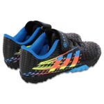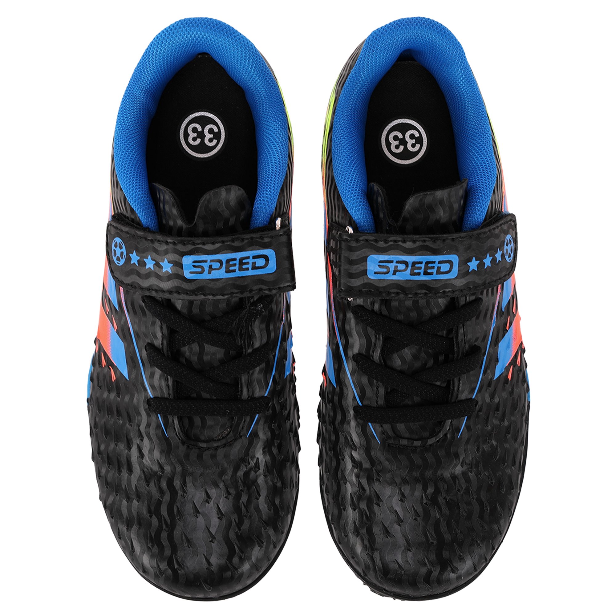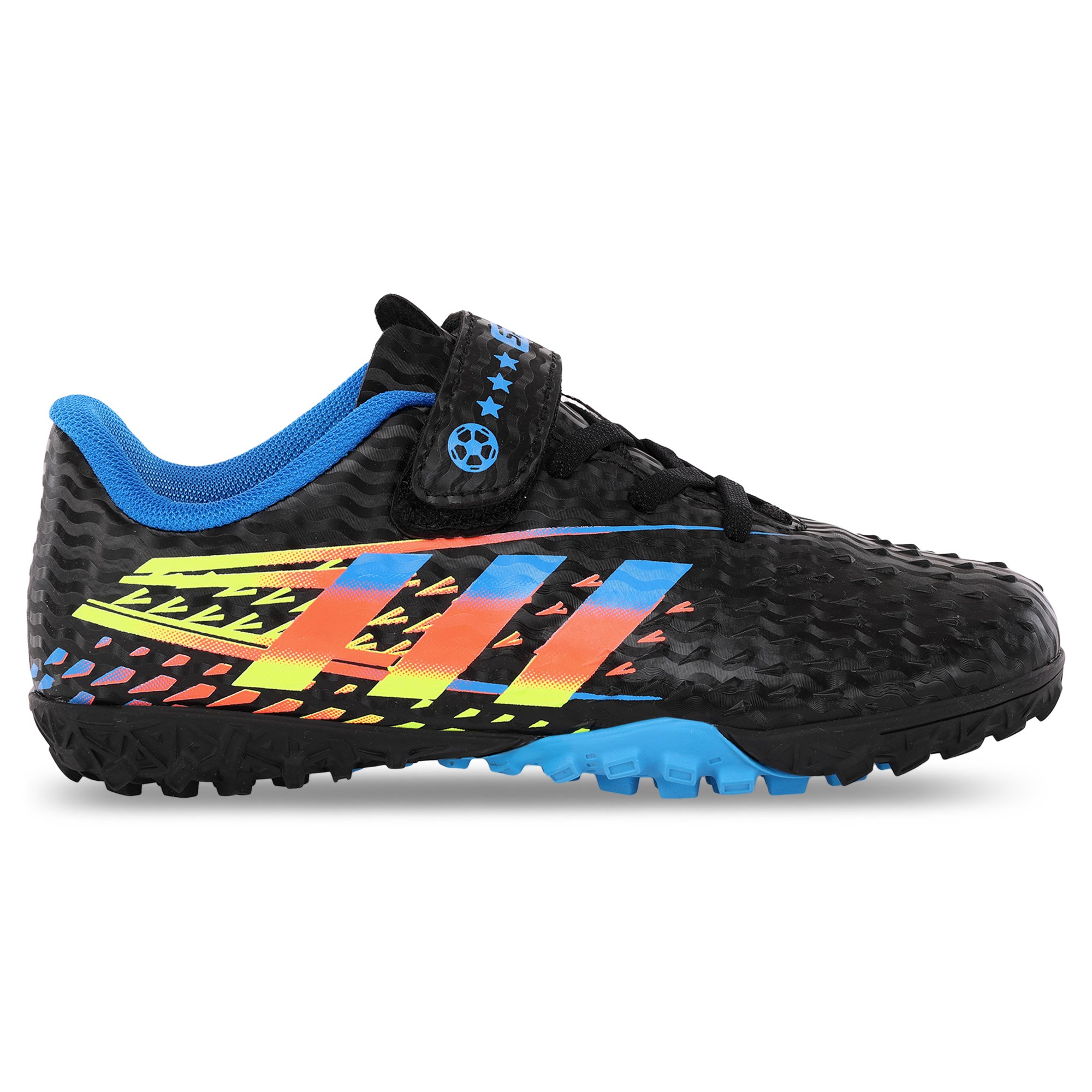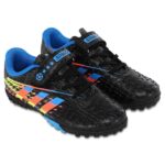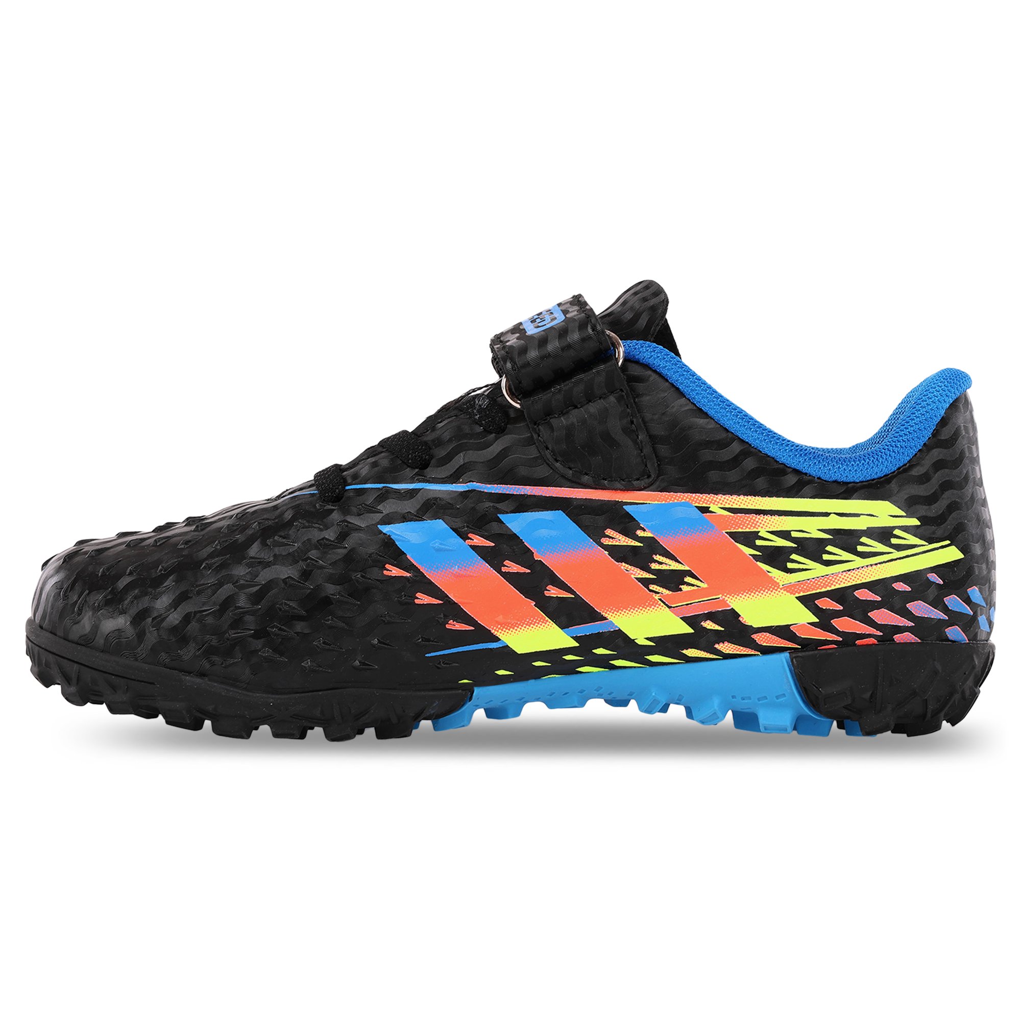 Футбольные сороконожки изготовлены из качественного полиуретана. Они предназначены для детей и представлены широким выбором размеров. Яркий дизайн верха футбольной обуви понравится любому ребёнку и сможет дополнить его футбольный образ. Верх сороконожек не гладкий, на нём имеется рельефный рисунок, который гарантирует хорошее сцепление с мячом и отличный контроль. Резиновая подошва усыпана мелкими шипами, которые позволяют улучшить манёвренность и сцепление с грунтовым покрытием поля, а также с ковролином. Сороконожки фиксируются на ногах с помощью шнуровки, дополнительную фиксацию обеспечивает липучка.