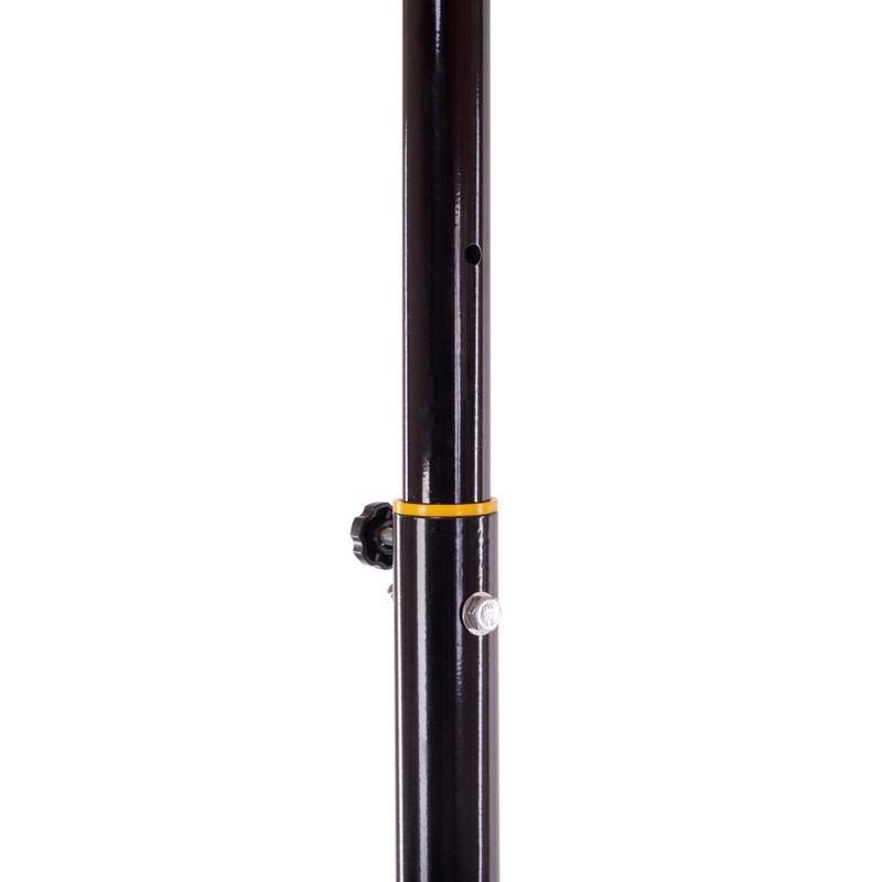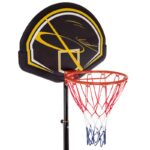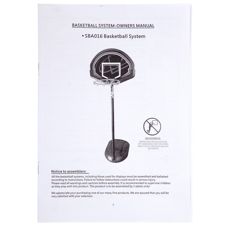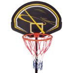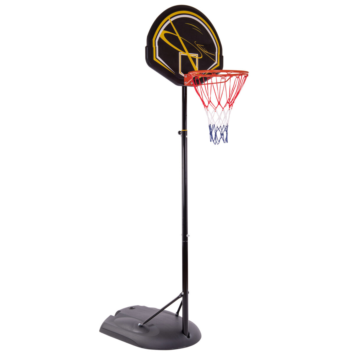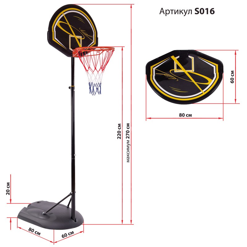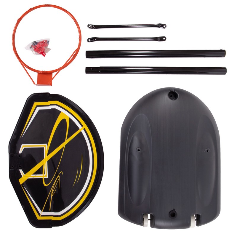 Кольцо изготовлено из металла и обладает высокой прочностью. Диаметр кольца составляет 38 см, а диаметр трубы, из которой оно выполнено, — 16 мм. Щит имеет уменьшенные размеры по сравнению с профессиональными моделями — 80×56×14 см. Высота стойки регулируется от 165 до 225 см. Для удобства перемещения стойка оснащена колёсиками.