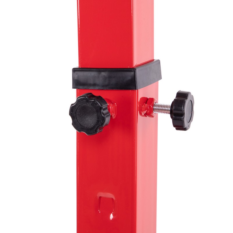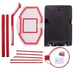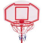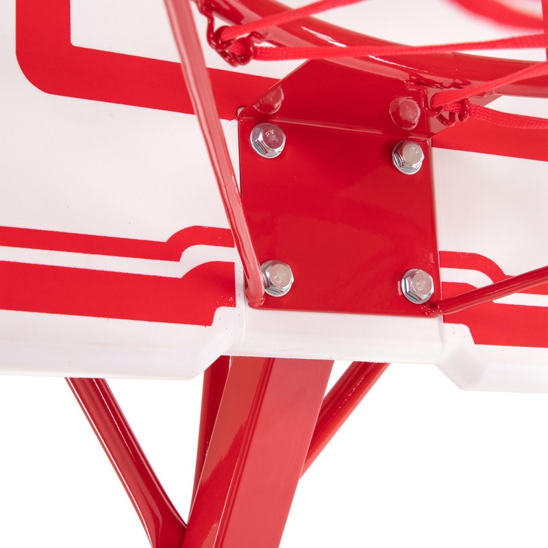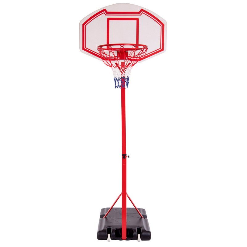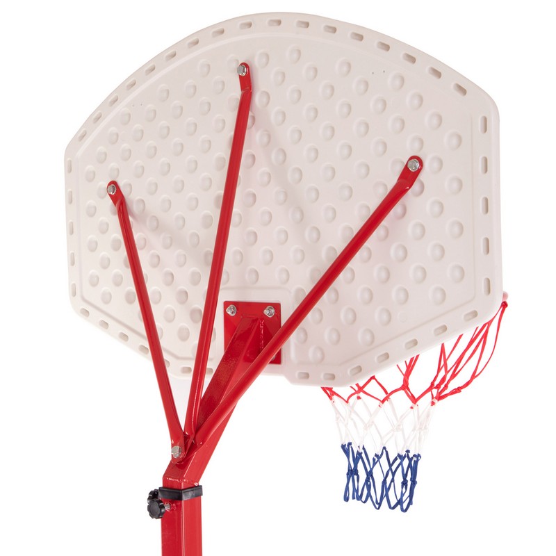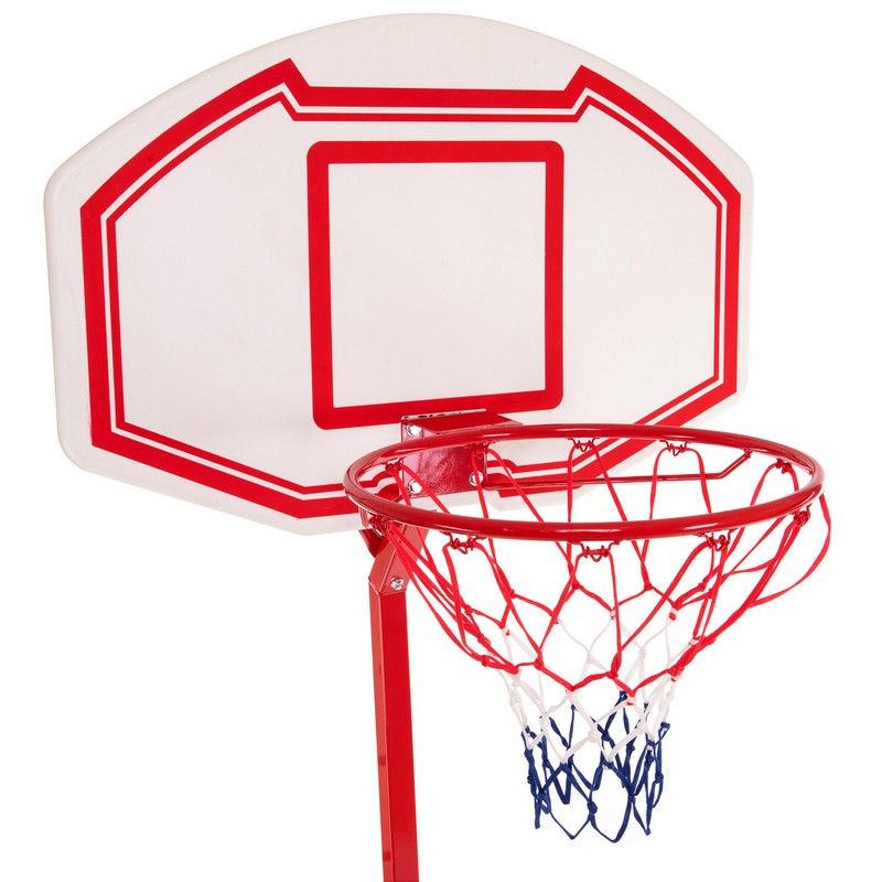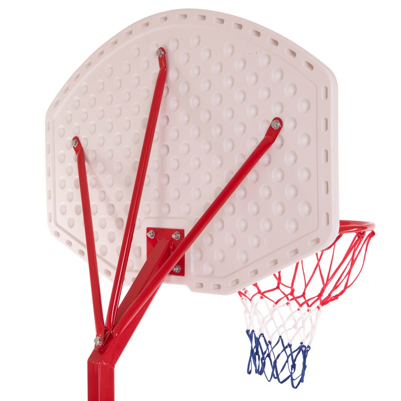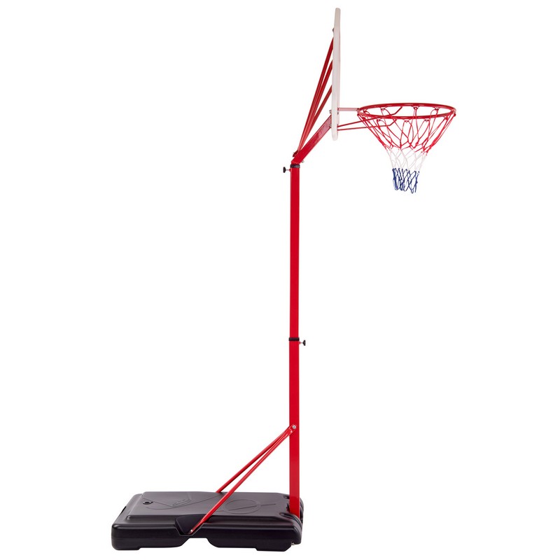 Высота стойки регулируется в пределах от 210 до 260 см. Размер кольца составляет 38 см, что соответствует 5 размеру мяча. Кольцо выполнено из металлической трубы диаметром 16 мм, что обеспечивает его прочность и устойчивость к нагрузкам. Размер щита составляет 90×60×17 см. На кольцо установлена яркая нейлоновая сетка.
