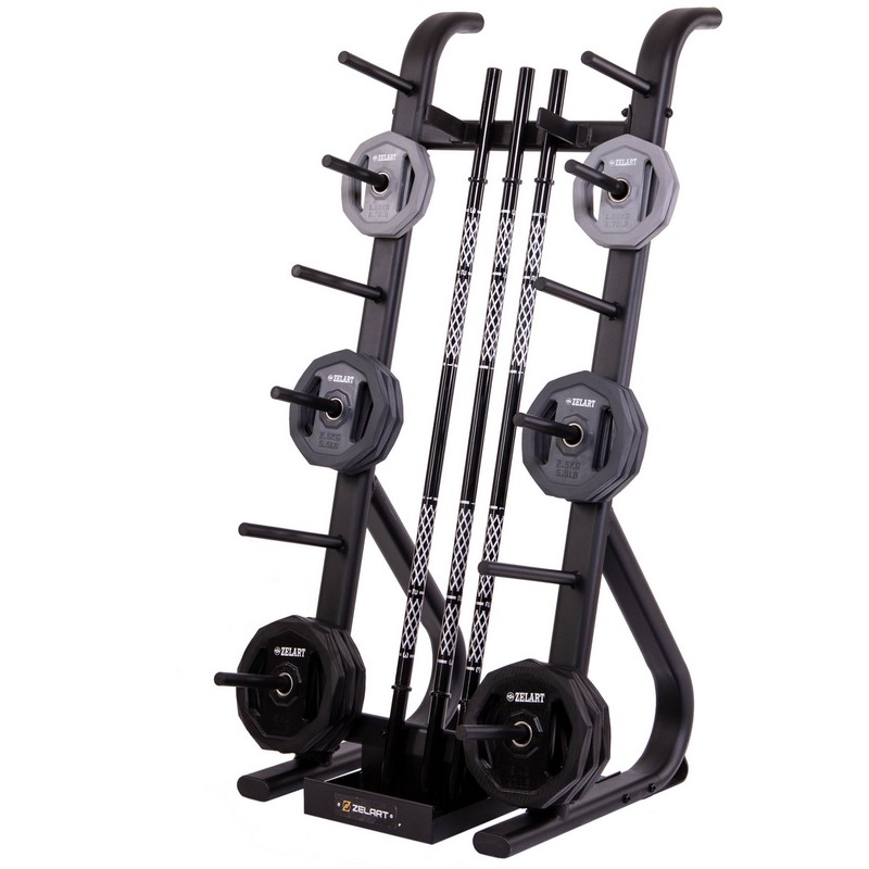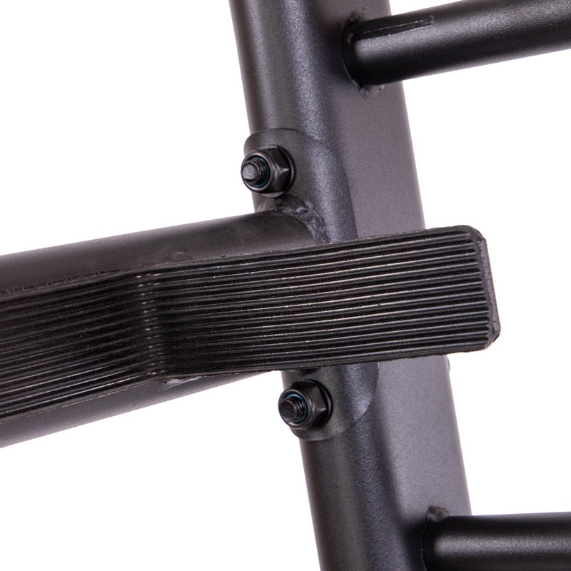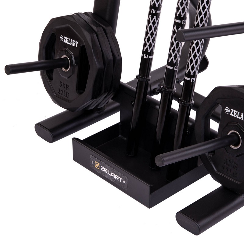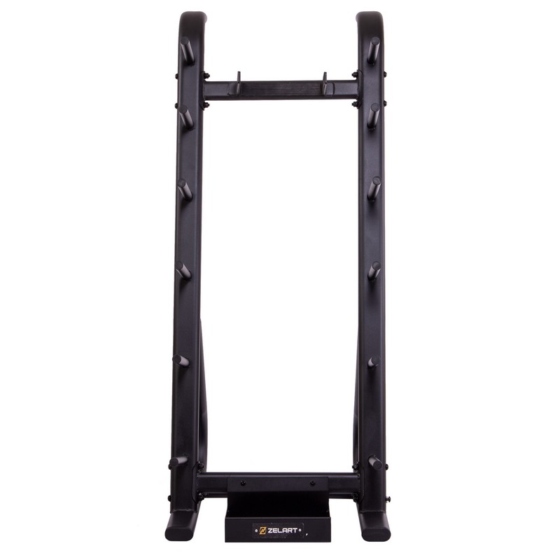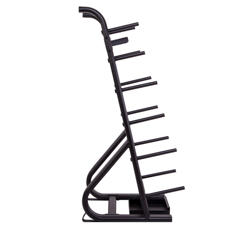Стойка выполнена из прочного металлического профиля и может выдерживать большой вес. По бокам расположены посадочные места для дисков, а грифы устанавливаются посередине. Для них имеется подставка в нижней части. Нижний край грифа не будет упираться в напольное покрытие. С каждой стороны стойки имеется по 6 посадочных мест для дисков. Чтобы во время хранения грифы не падали на диски, в верхней части конструкции предусмотрены ограничители.