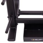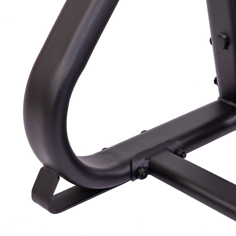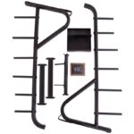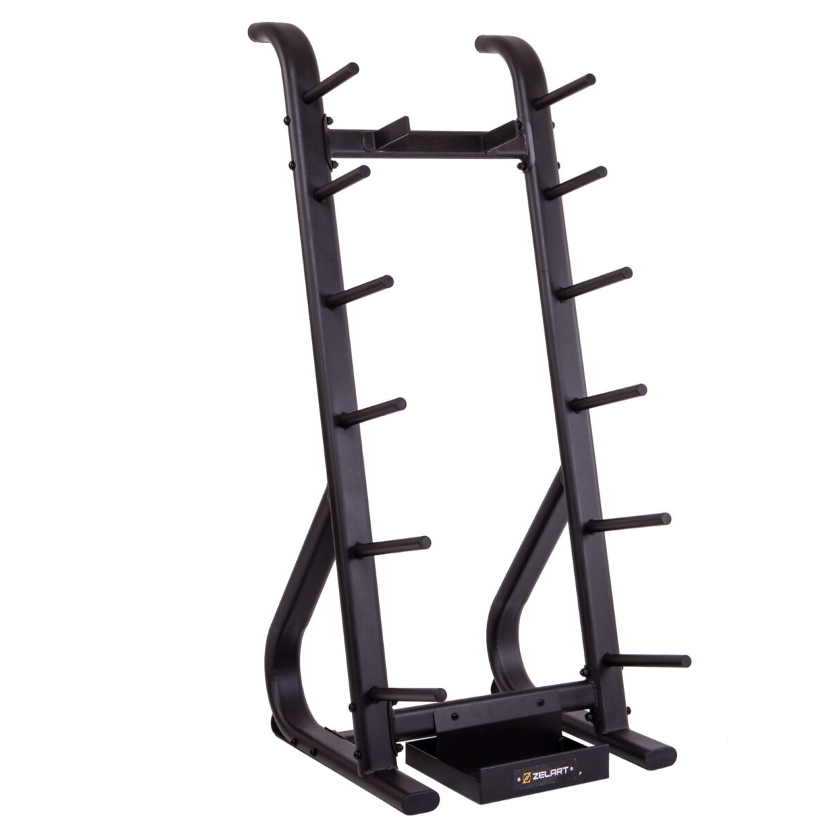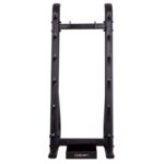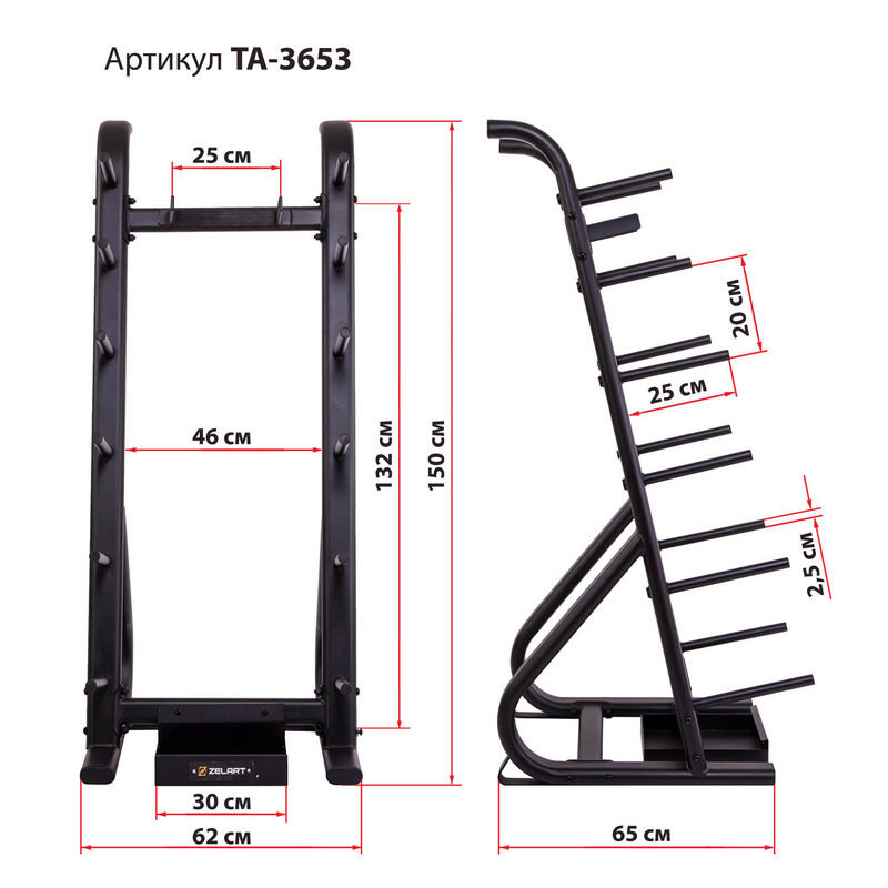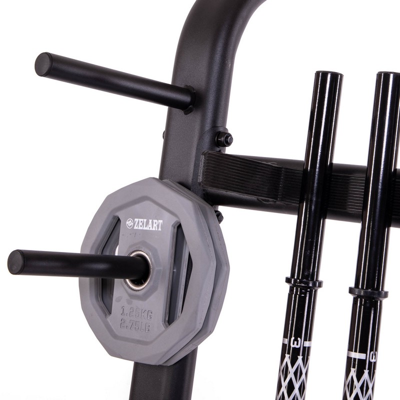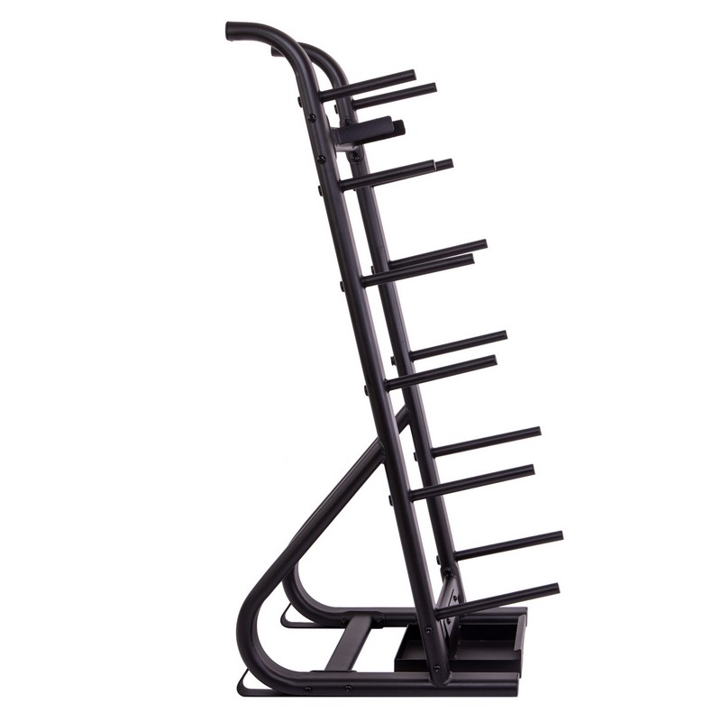Стойка выполнена из прочного металлического профиля и может выдерживать большой вес. По бокам расположены посадочные места для дисков, а грифы устанавливаются посередине. Для них имеется подставка в нижней части. Нижний край грифа не будет упираться в напольное покрытие. С каждой стороны стойки имеется по 6 посадочных мест для дисков. Чтобы во время хранения грифы не падали на диски, в верхней части конструкции предусмотрены ограничители.