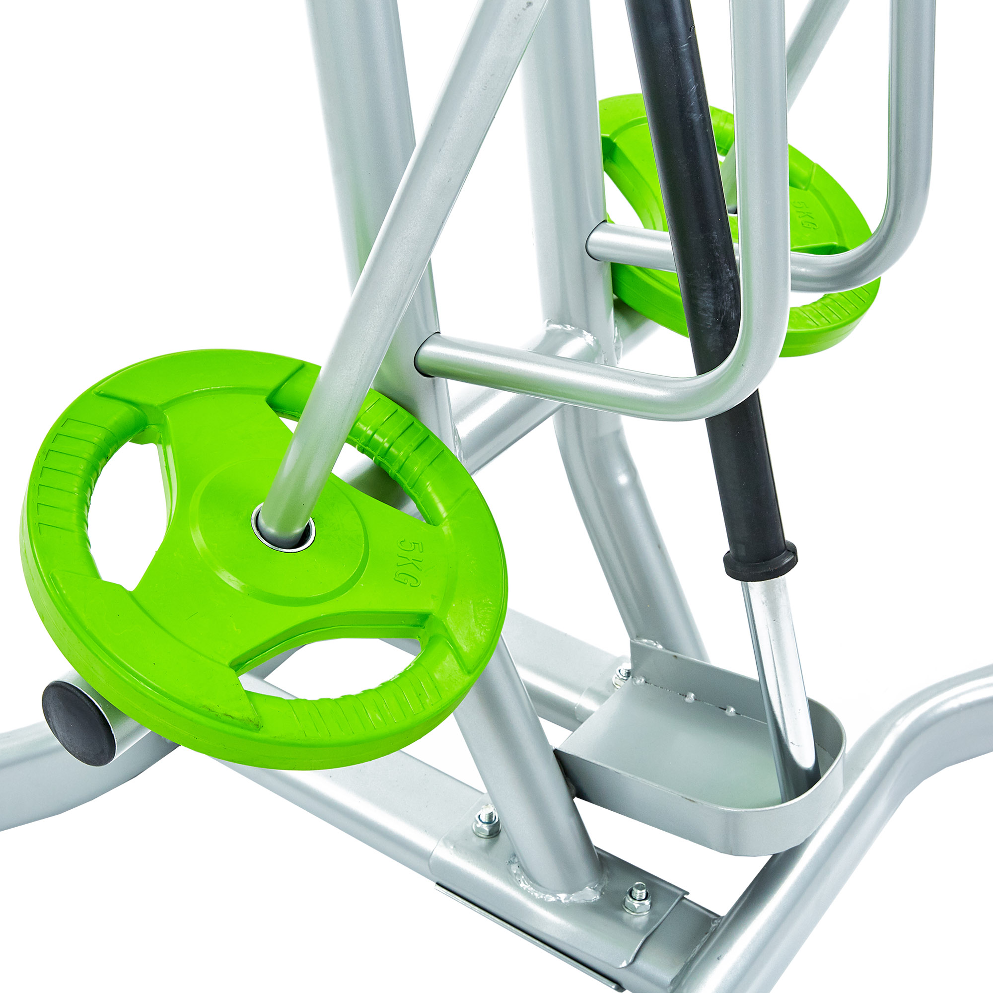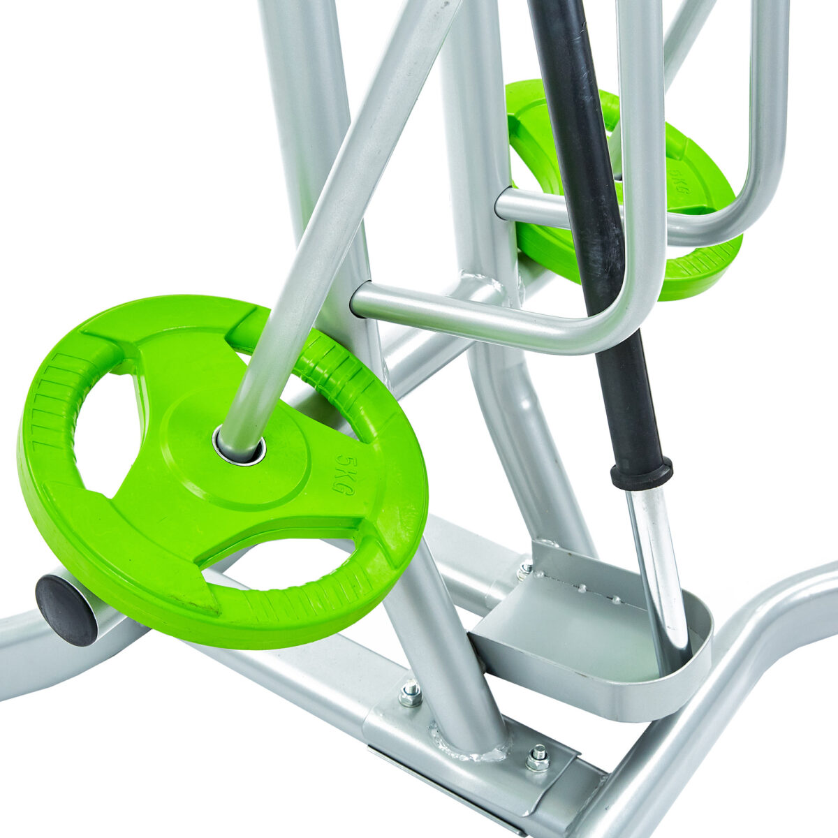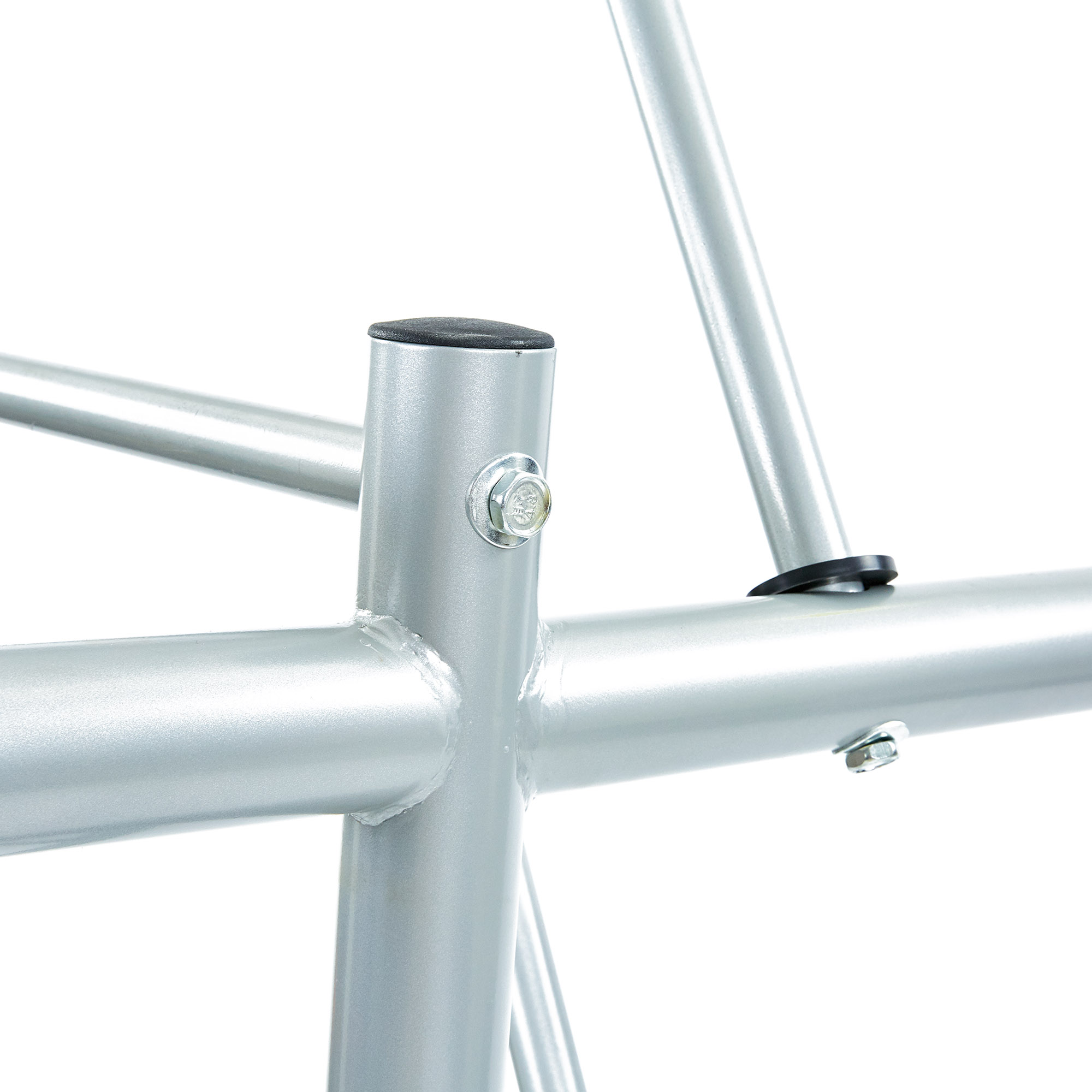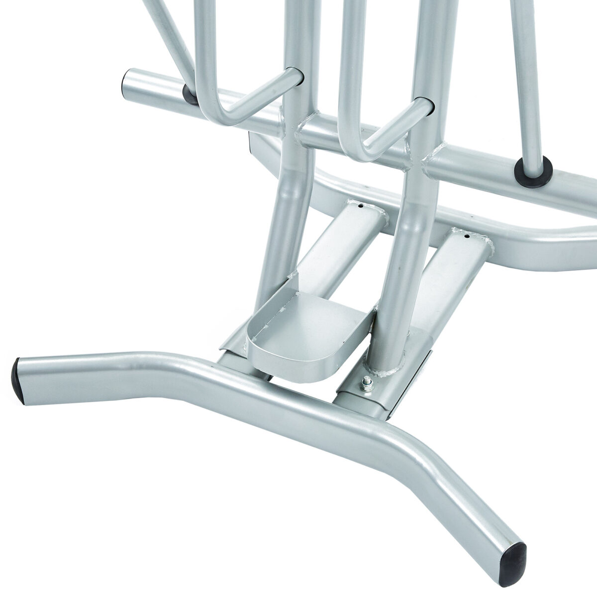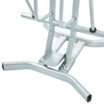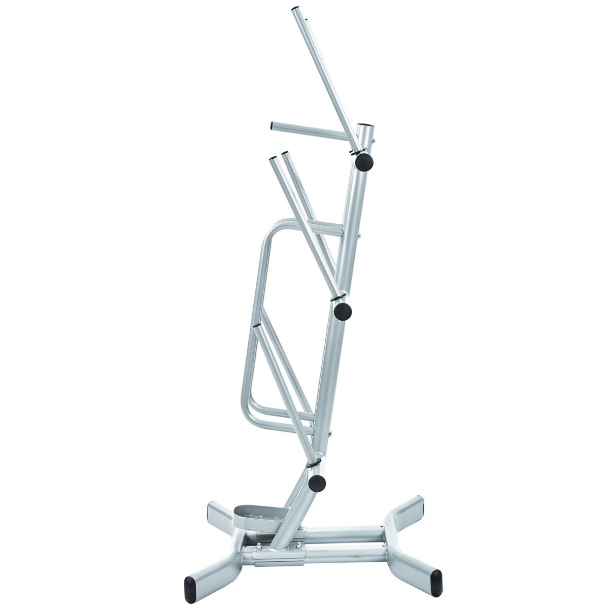 Стойка вертикальная изготовлена из металлических труб разного диаметра. Более толстые трубы использованы в раме, а тонкие выполняют функцию нагрузочных колышков для блинов. Две изогнутые трубы обеспечивают дополнительную стабильность конструкции, а также служат опорой грифам и бодибарам, которые ставятся в специальный короб, смонтированный в нижней части подставки. Стойка выполнена под наклоном, чтобы снаряды оставались на месте и не могли случайно упасть. Устойчивость конструкции обеспечивают дугообразные опорные ножки.