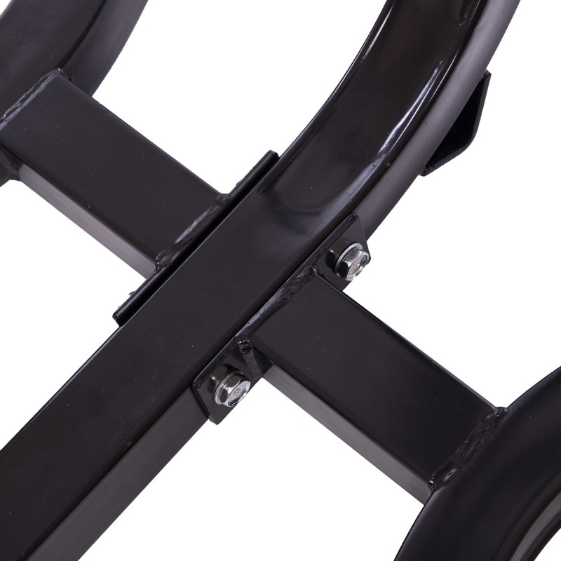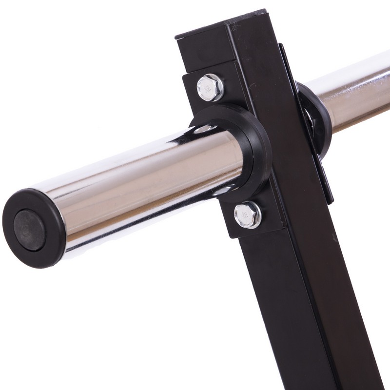 Конструкция выполнена из прочного металла и способна выдерживать значительные нагрузки. Для устойчивости в нижней части стойки размещены пластиковые накладки. Края посадочных втулок оборудованы пластиковыми заглушками, обеспечивающими безопасность использования.