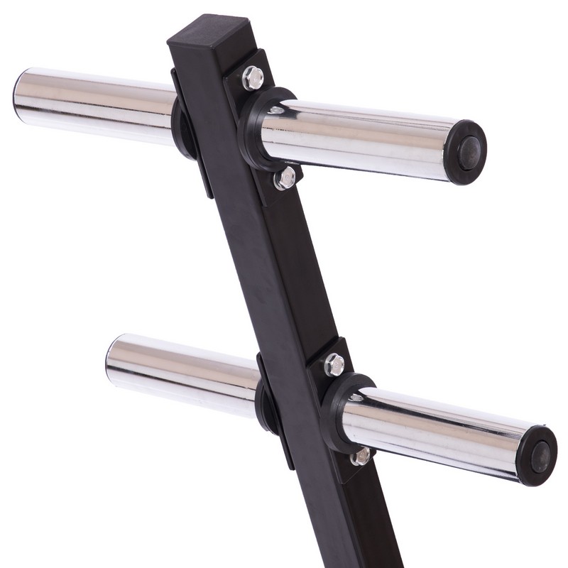 Вертикальная стойка для хранения дисков и грифов от бренда Zelart позволяет разместить полный комплект инвентаря на очень небольшом пространстве. Для установки стойки требуется площадь всего 69×64 см. Этого достаточно, чтобы хранить 3 грифа и 6 комплектов дисков разного веса. На стойке предусмотрено по 3 посадочные втулки для дисков с каждой стороны. Диаметр посадочных втулок соответствует диаметру олимпийского грифа. Диаметр стаканов для хранения грифов составляет 56 мм, что делает стойку подходящей для олимпийских грифов.
