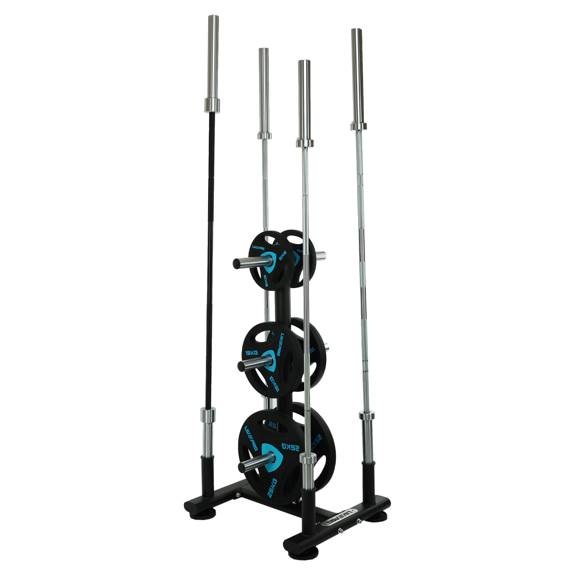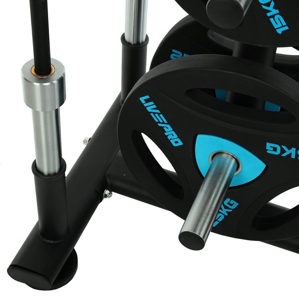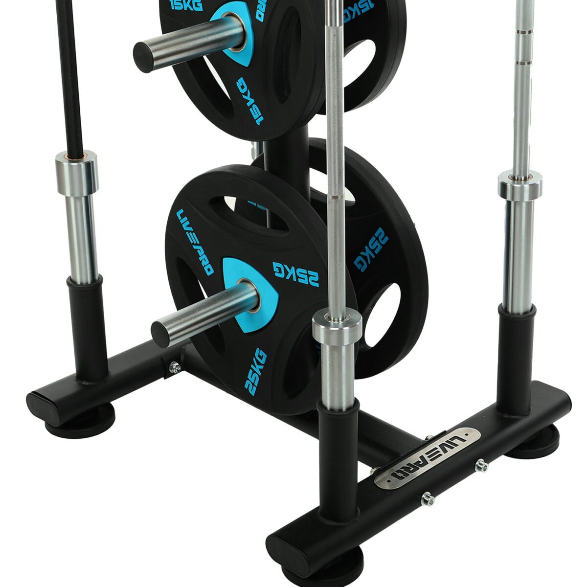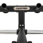 Передвижная стойка от LiveUp предназначена для хранения олимпийских дисков и грифов. Посадочные места для дисков и штанги подогнаны под размер именно этого типа инвентаря.