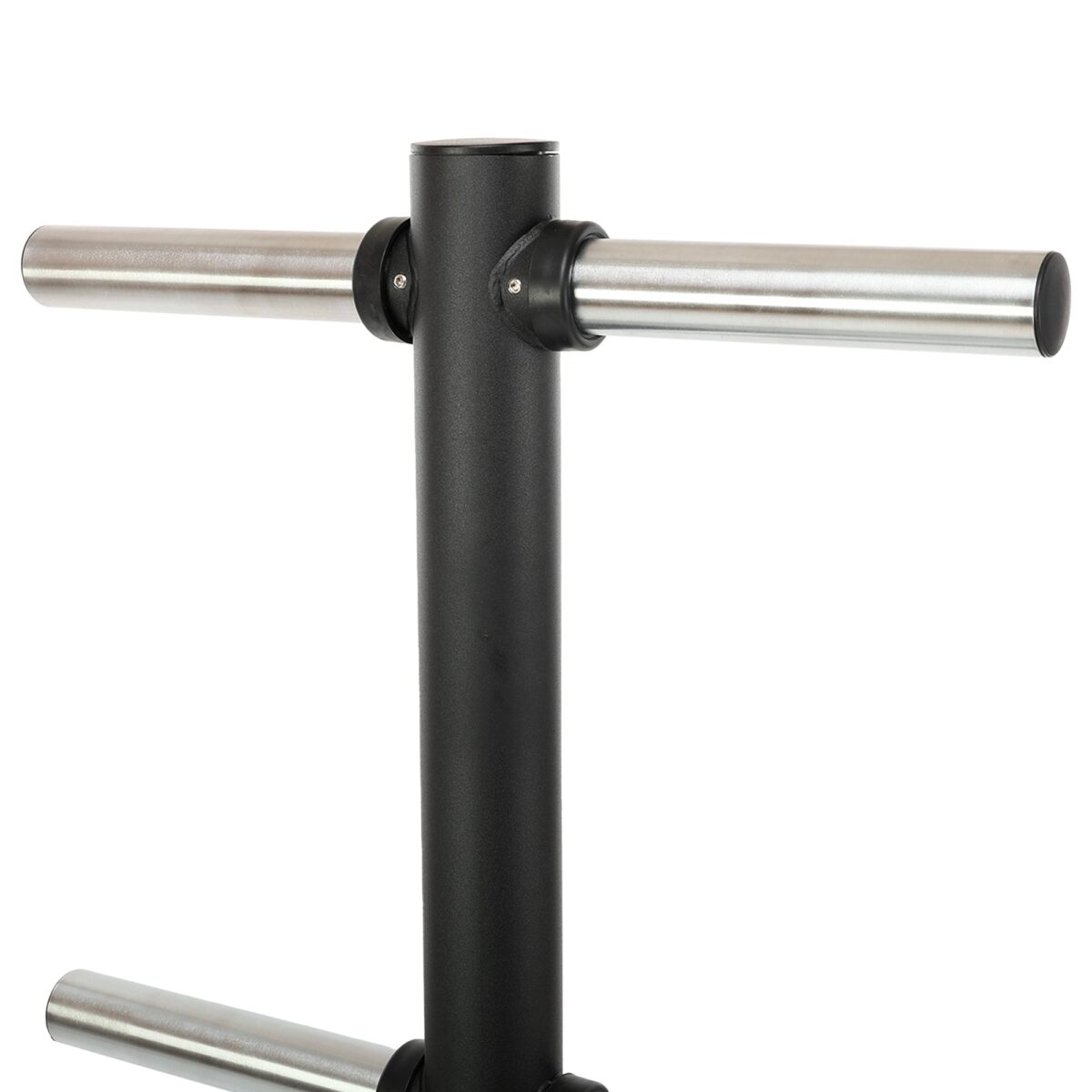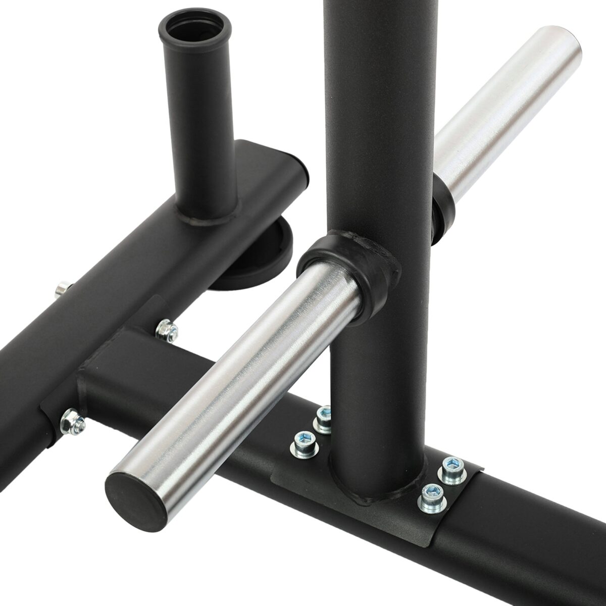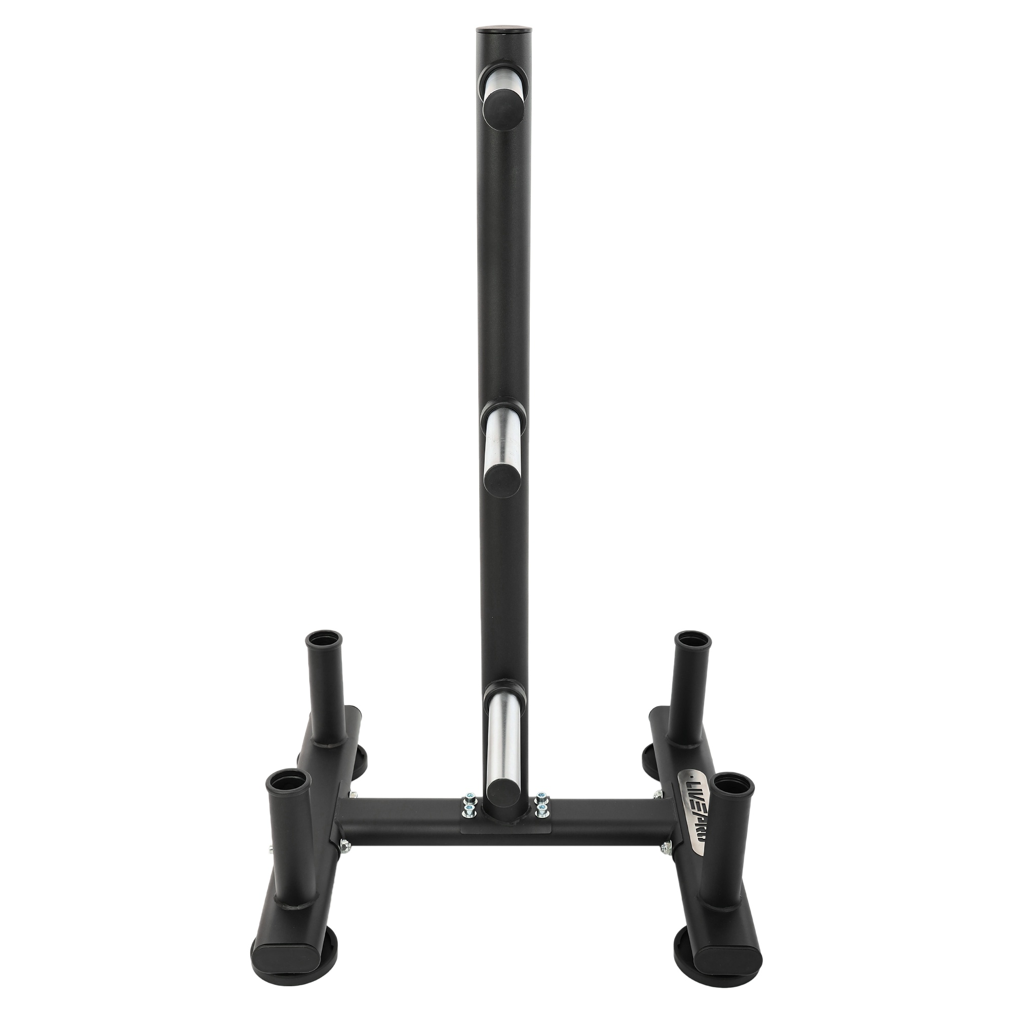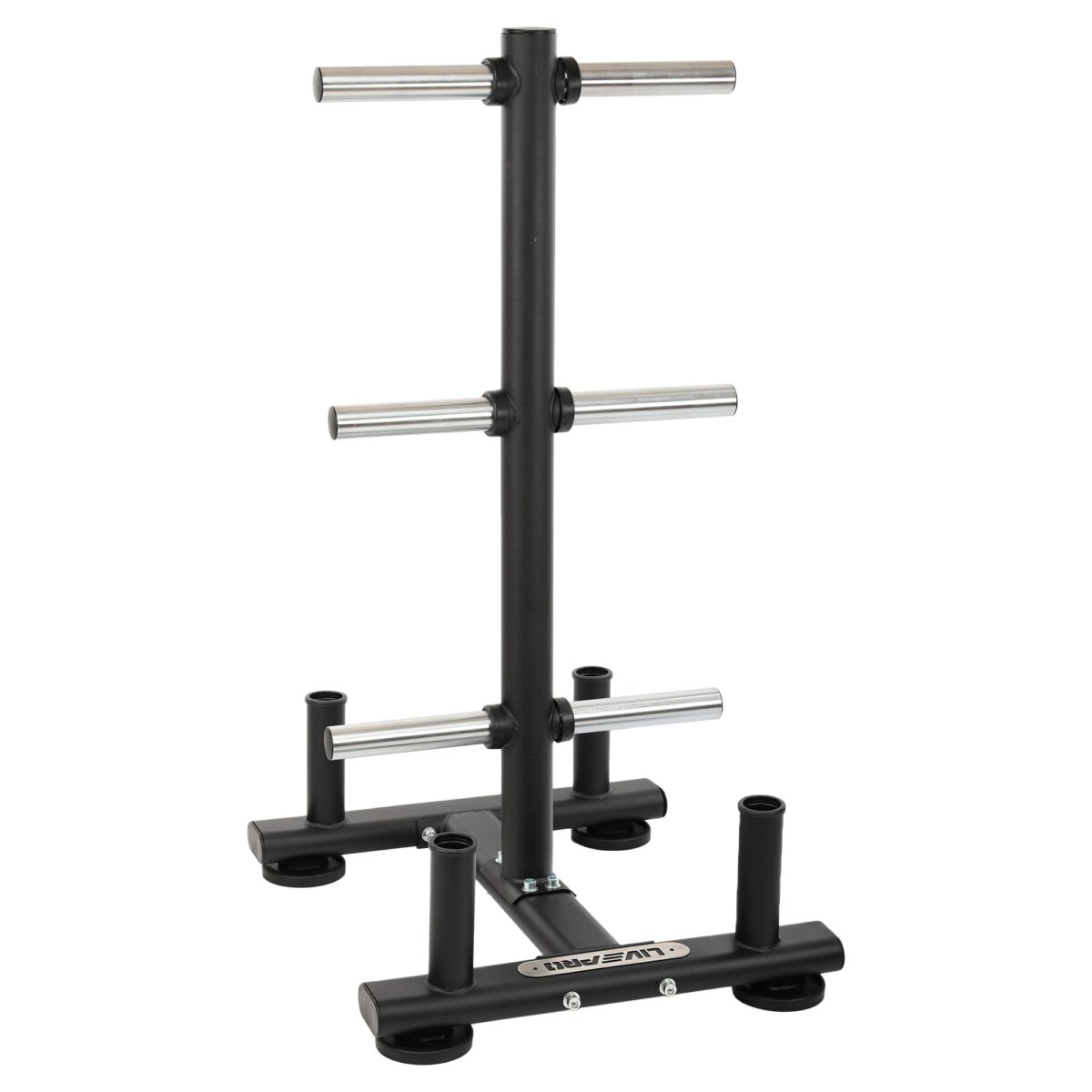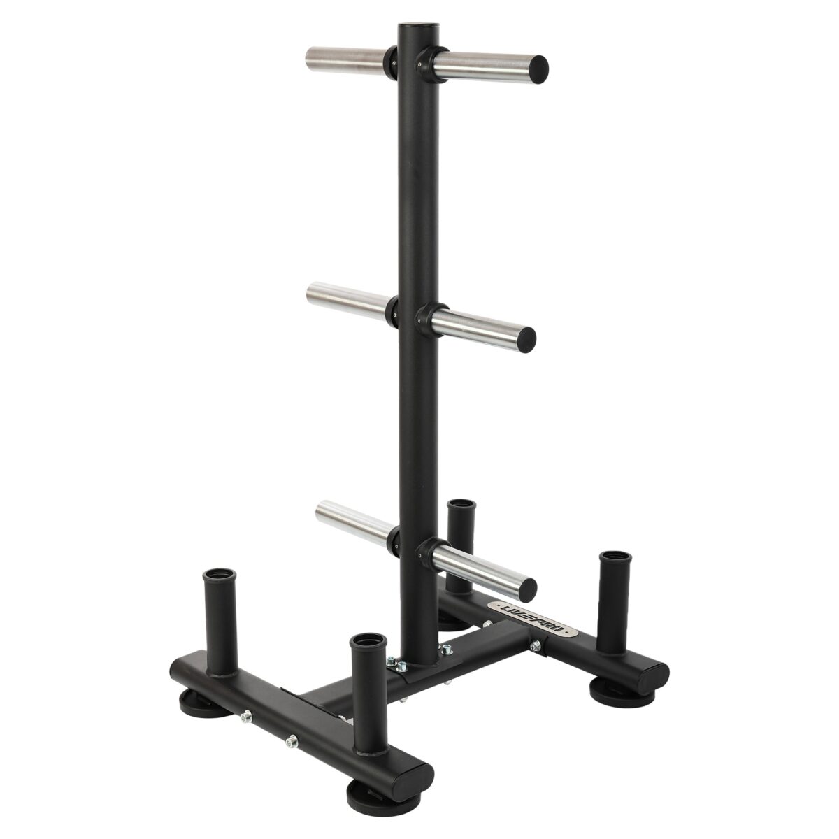 При изготовлении стойки используется технология бесшовной сварки. Она позволяет сделать конструкцию не только прочной, но и эстетичной. Посадочные места для дисков хромированы для защиты от коррозии. Всего их 6. Для хранения грифов предусмотрено 4 места.
