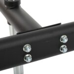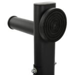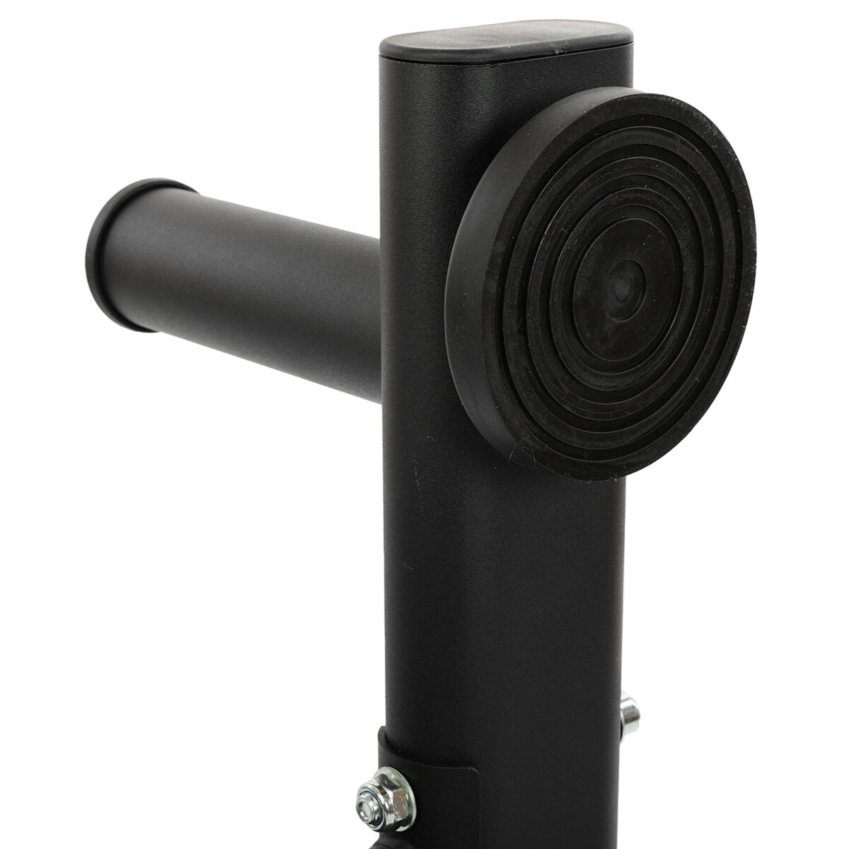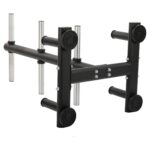 Металлический каркас стойки покрыт черной порошковой краской. Это добавляет конструкции привлекательности и отлично защищает ее от коррозии. Чтобы на полу не появлялись царапины, в конструкции стойки предусмотрены резиновые накладки. Широкие упоры обеспечивают стойке стабильность.