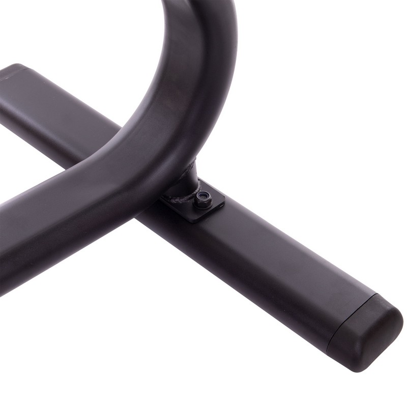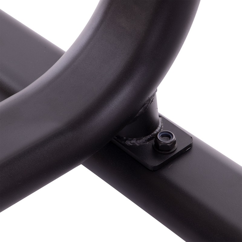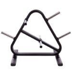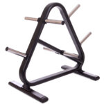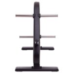 Cтойка для дисков, изготовленная из профильной трубы. Стойка окрашена краской черного цвета для защиты от коррозии. Конструкция стойки включает 7 посадочных втулок для дисков от штанги. Несмотря на компактные размеры и высоту 109 см, стойка может вместить полный комплект дисков для штанги. Диски разного веса будут располагаться на разных втулках.