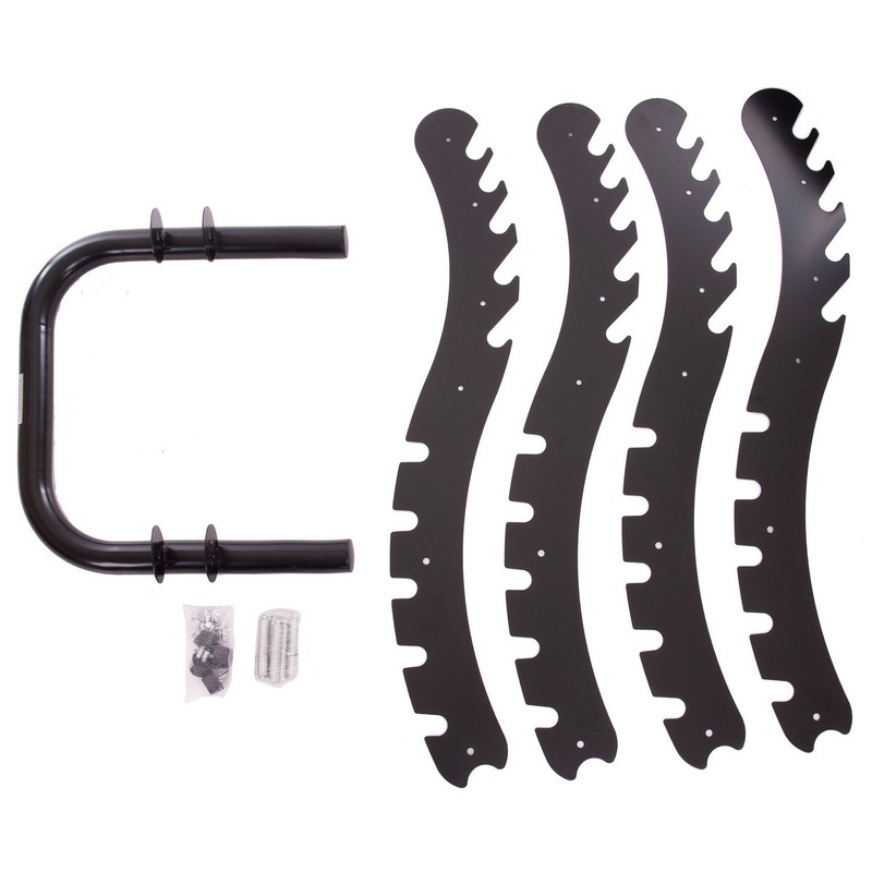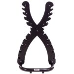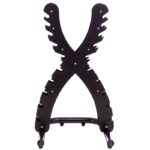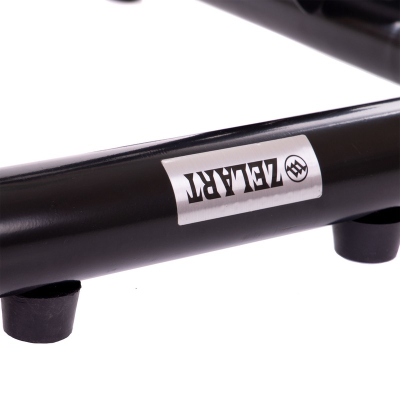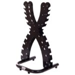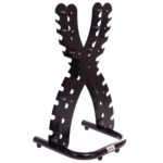 Стойка имеет Х-образную форму. Она выполнена из металла, который покрыт черной краской. Конструкция соединяется с помощью болтов и гаек, и при необходимости ее можно разобрать на несколько элементов для удобной транспортировки.