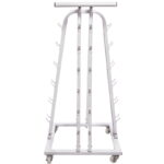 Вертикальная стойка рассчитана на 12 пар гантелей и имеет форму пирамиды. Она выполнена из металлических труб и обладает большим запасом прочности. Основание стойки выполнено из профильной трубы, на которой закреплены 4 колеса для удобного перемещения стойки по залу. Колеса выполнены из прочного материала, способного выдержать вес нагруженной конструкции.