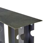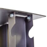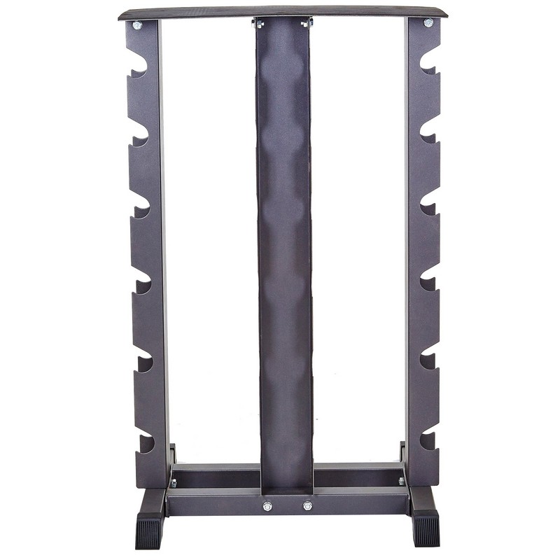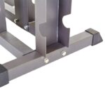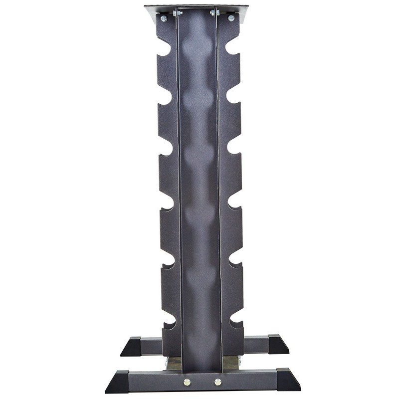 Стойка выполнена из металлического профиля, в котором проделаны пазы под гантели. В нижней части использована профильная труба, из нее выполнена крестовина, которая обеспечивает стабильность конструкции. Накладки из пластика защищают напольное покрытие от контакта с металлом и повреждений.