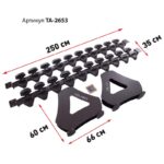 Горизонтальная стойка для гантелей, которая имеет габаритные размеры 75x20x25,5 см. Стойка позволяет удобно разместить весь гантельный ряд и сделать каждую единицу инвентаря одинаково доступной для пользователя. Обычно такое оборудование устанавливают возле зеркала.
