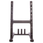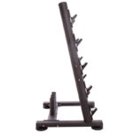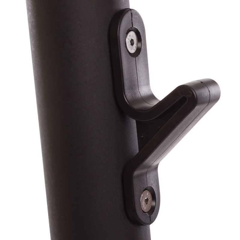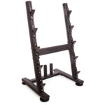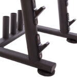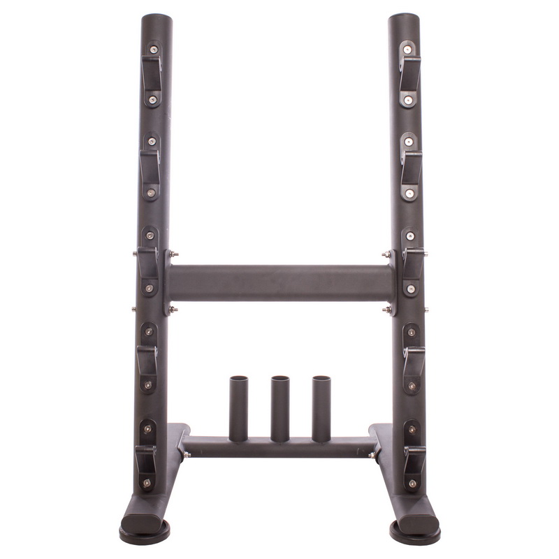 Несмотря на компактные размеры, стойка вмещает довольно внушительное количество инвентаря: 5 штанг с фиксированным весом и 3 грифа. Для штанг предусмотрены изогнутые крюки, а грифы устанавливаются в специальные металлические стаканы. Преимуществом данной конструкции является её универсальность — на ней можно хранить штанги и грифы любого диаметра и длины.