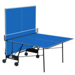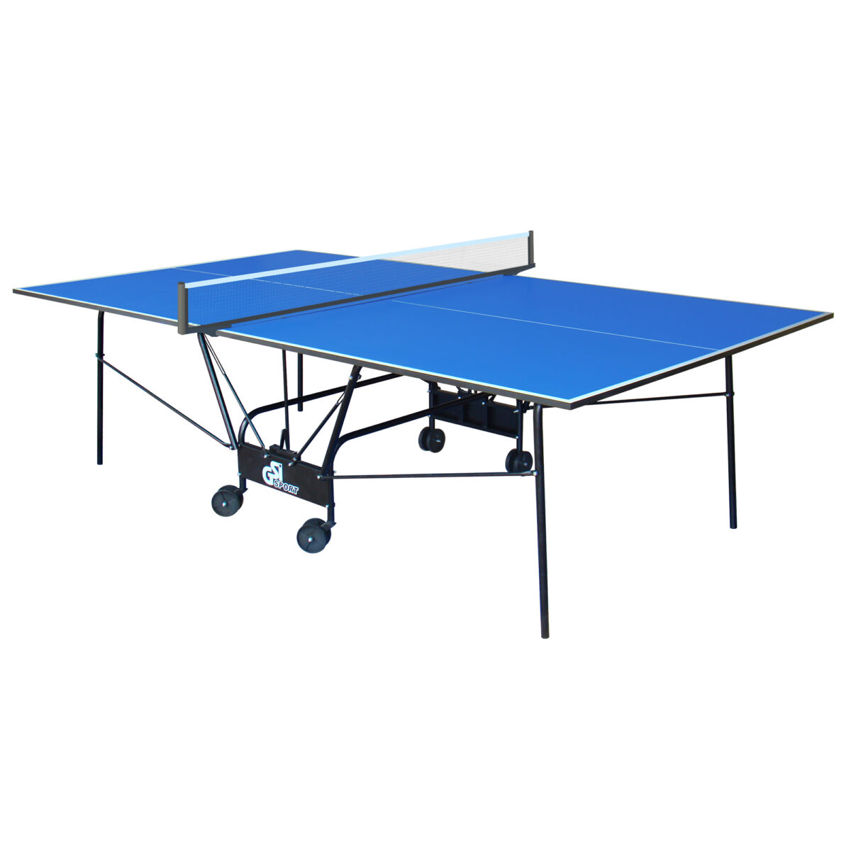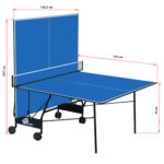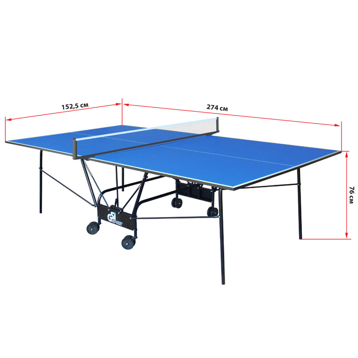 Поверхность стола выполнена в синем цвете, что придает ему стильный и современный вид, соответствующий международным стандартам настольного тенниса.