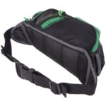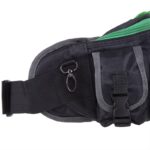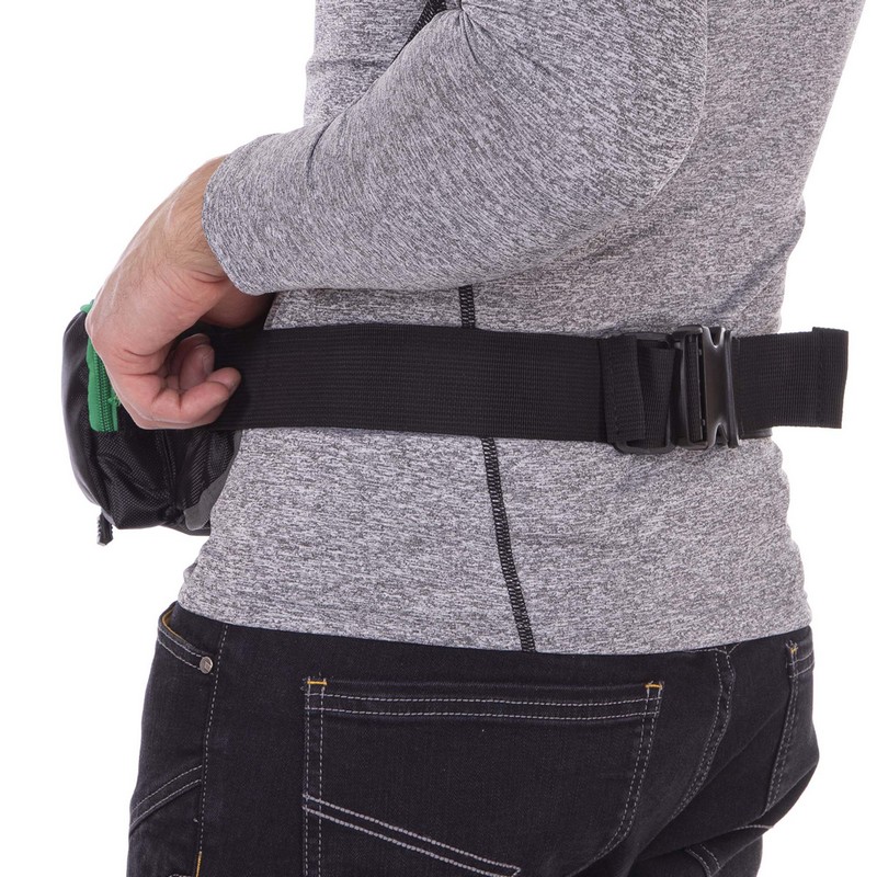 Сумка крепится на пояс с помощью ремня. Застежка расположена сзади. Задняя стенка сумки сетчатая. Такой материал лучше пропускает воздух и тепло, не перегревает тело.