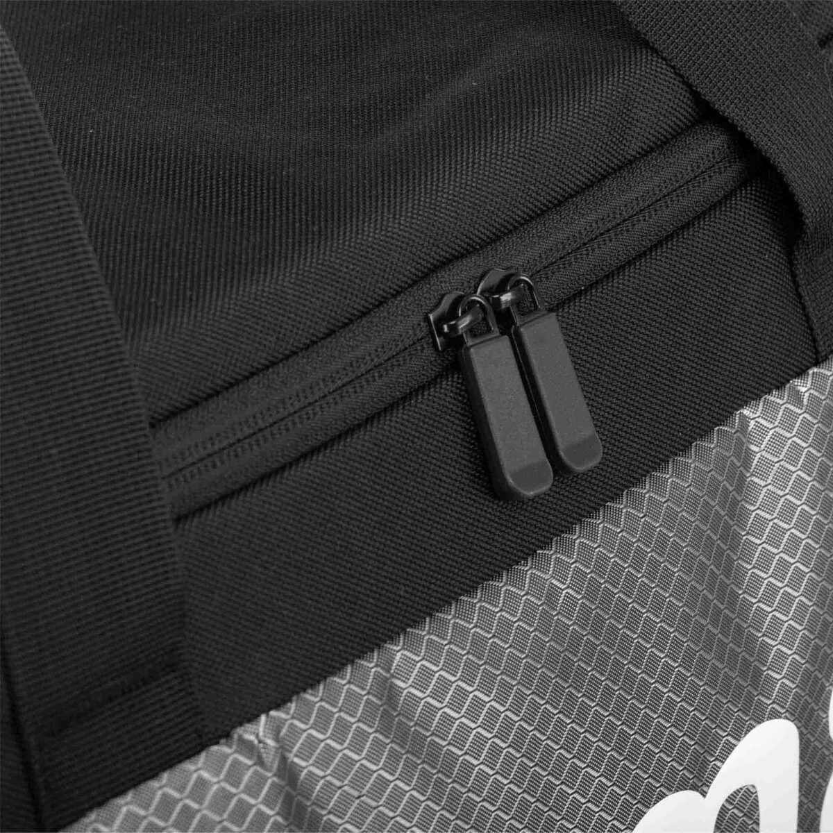 Вместительное основное отделение сумки оборудовано удобной двойной молнией, которая обеспечивает быстрый доступ к вещам. По бокам на сумке расположены большое отделение для обуви и карман для мелких вещей. Система хранения продумана таким образом, чтобы спортсмен мог отделить сменную обувь от одежды и душевых принадлежностей, и всегда держал под рукой важные мелочи: ключи, телефон и прочее. Удобно носить сумку позволяют две мягкие ручки и регулируемый плечевой ремень с защитной накладкой на плечо.