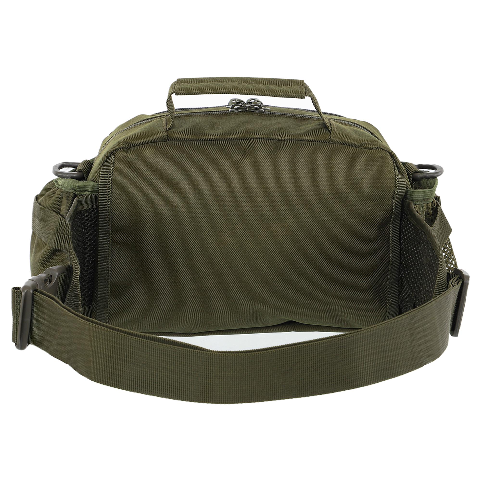 Главное отделение сумки закрывается на молнию, по бокам расположены сетчатые карманы, а на лицевой части расположился дополнительный карман на молнии и прочные нейлоновые стропы, к которым можно присоединить дополнительные аксессуары или подсумки, увеличивая тем самым переносимый объем.
