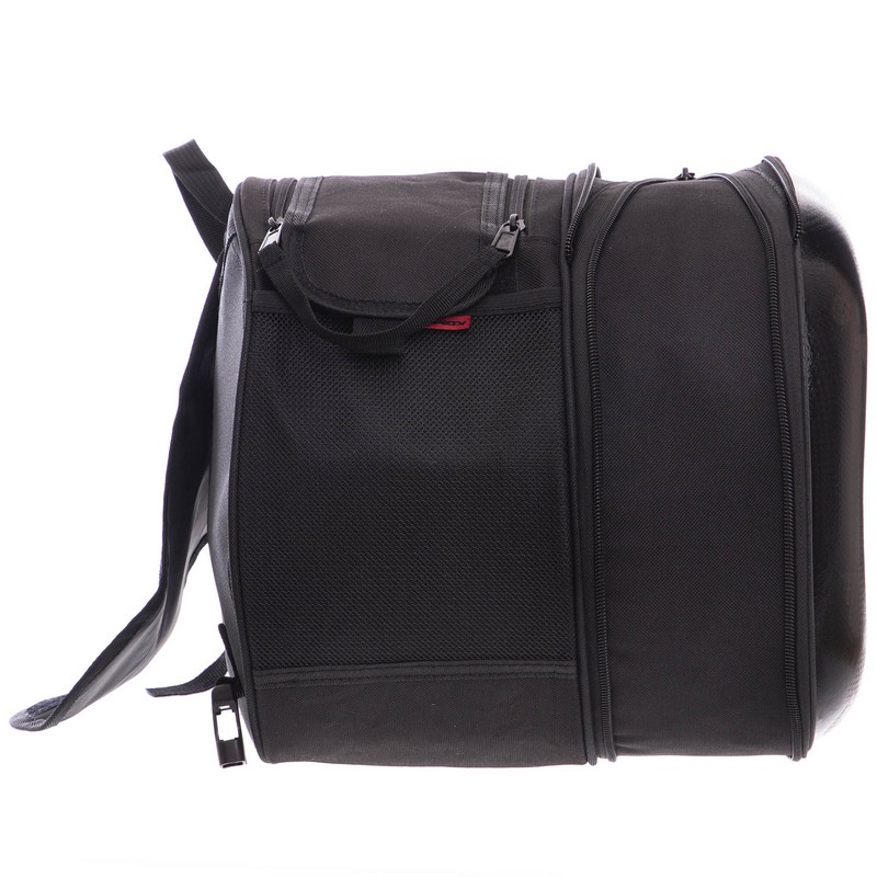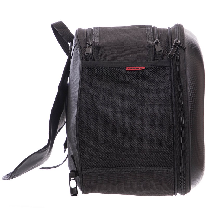 Вместительность мотосумки можно менять. Для этого сбоку есть молния. Если она расстегнута, то сумка вмещается в себя максимальный объем — 27 л. Если молния закрыта, то сумка будет занимать меньше места, и ее вместительность уменьшится.